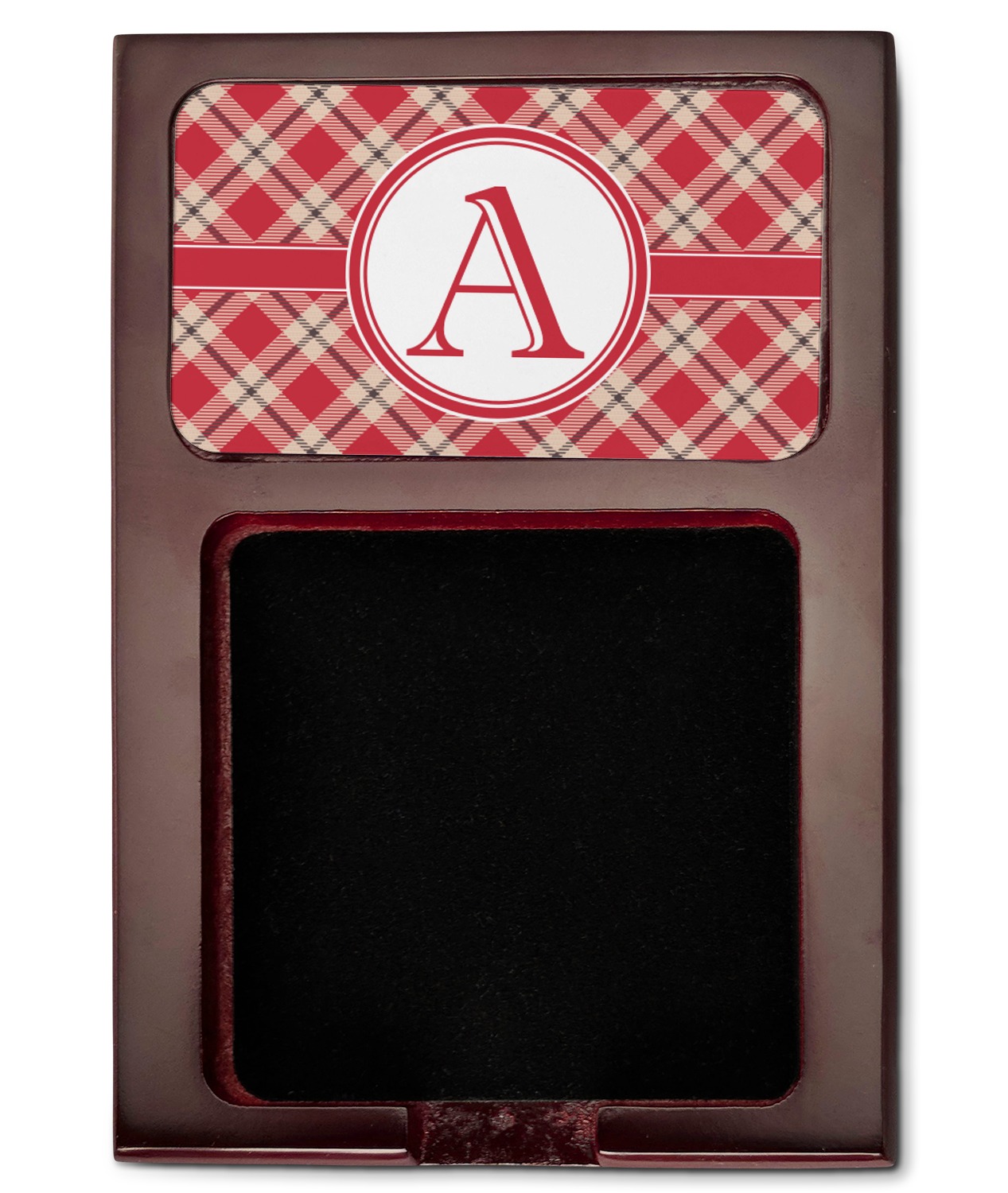 Crafted from a fine mahogany, this post it note holder is in the shade of a dark, cherry color. The dispenser itself is about 4.25 by 6.25 by 0.75 inches. You can place your 3 by 3 inch sticky notes in the indentation below the nameplate. We print your customization onto the nameplate that rests above the velvety indentation.