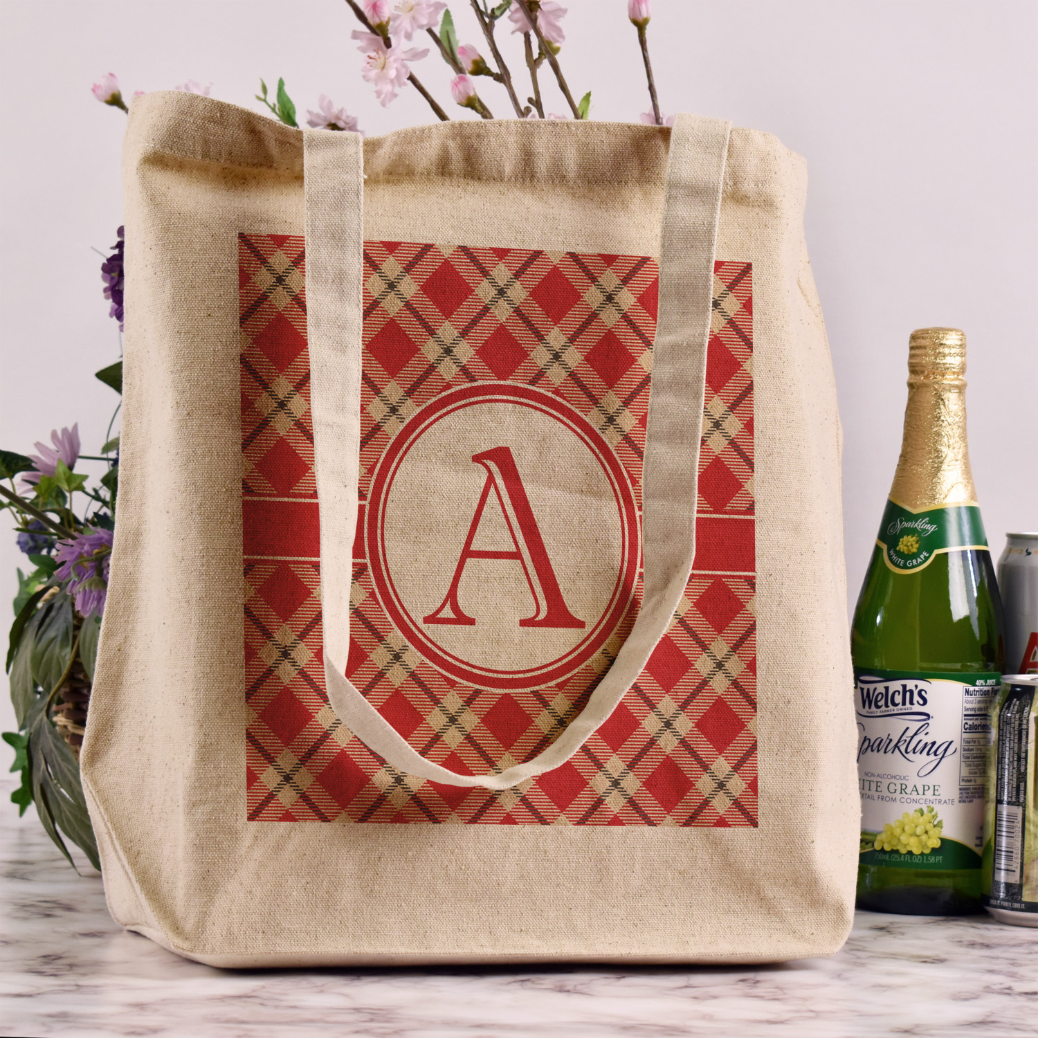 For our design, we chose a simple plaid; we chose red & tan to create a unisex palette and used dark grey for our accent color. We also chose the classic ribbon and round label with an elegant initial for our very simple, yet elegant personalization.