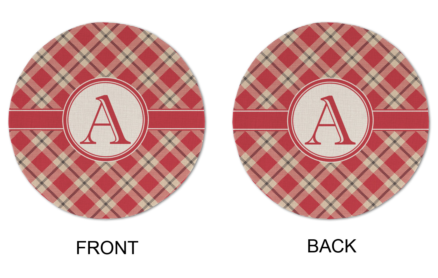 For our design, we chose a simple plaid; we chose red & tan to create a unisex palette and used dark grey for our accent color. We also chose the classic ribbon and round label with an elegant initial for our very simple, yet elegant personalization.