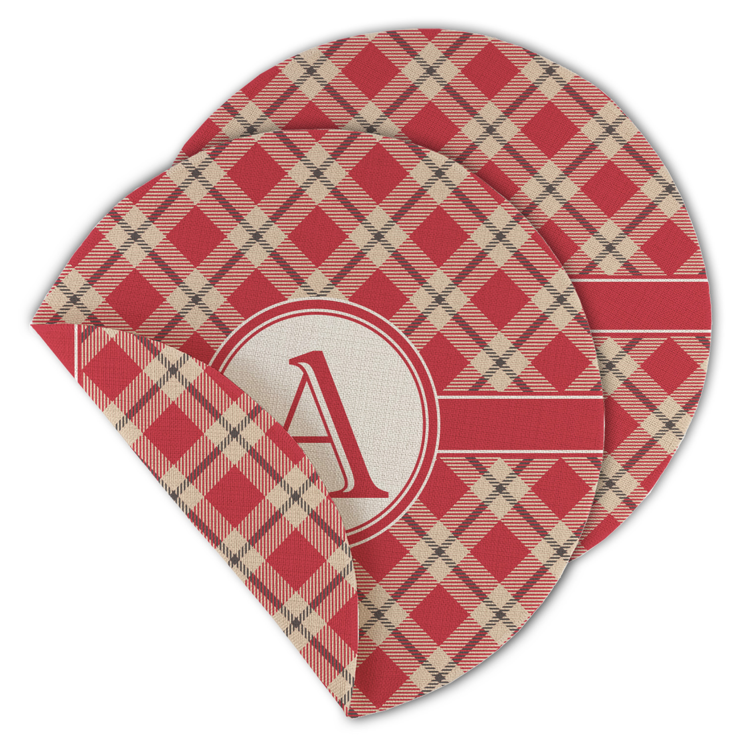 For our design, we chose a simple plaid; we chose red & tan to create a unisex palette and used dark grey for our accent color. We also chose the classic ribbon and round label with an elegant initial for our very simple, yet elegant personalization.