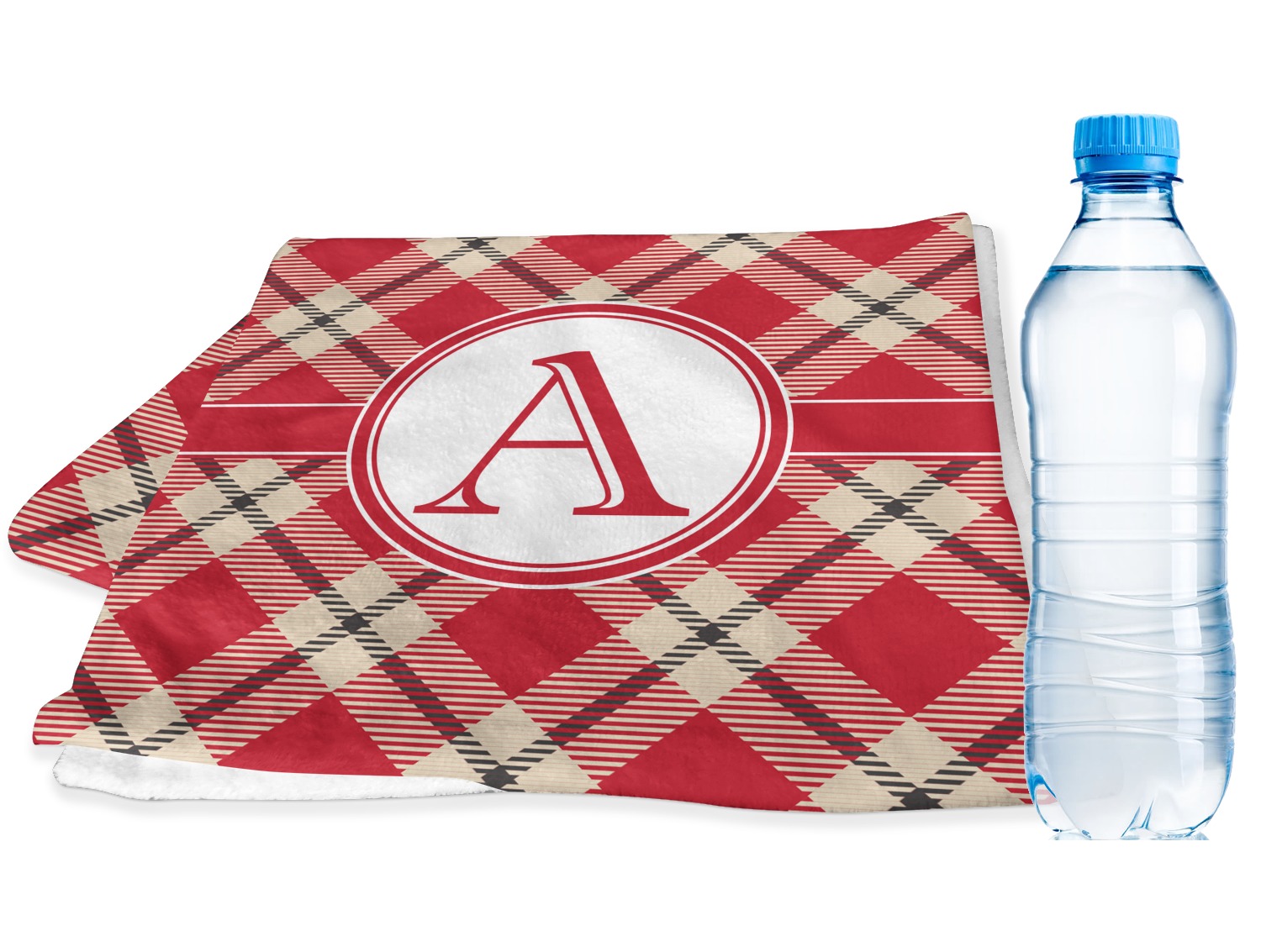 For our design, we chose a simple plaid; we chose red & tan to create a unisex palette and used dark grey for our accent color. We also chose the classic ribbon and round label with an elegant initial for our very simple, yet elegant personalization.
