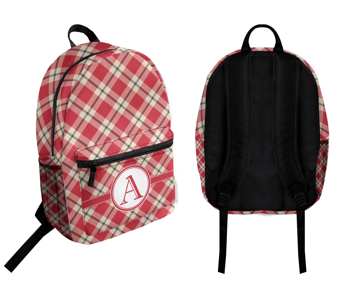 For our design, we chose a simple plaid; we chose red & tan to create a unisex palette and used dark grey for our accent color. We also chose the classic ribbon and round label with an elegant initial for our very simple, yet elegant personalization.