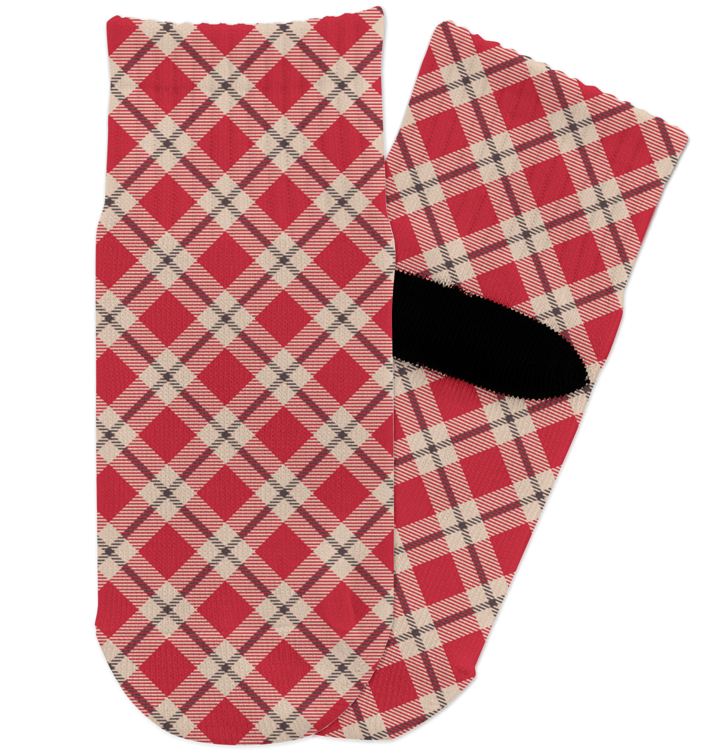 For our design, we chose a simple plaid; we chose red & tan to create a unisex palette and used dark grey for our accent color. We also chose the classic ribbon and round label with an elegant initial for our very simple, yet elegant personalization.