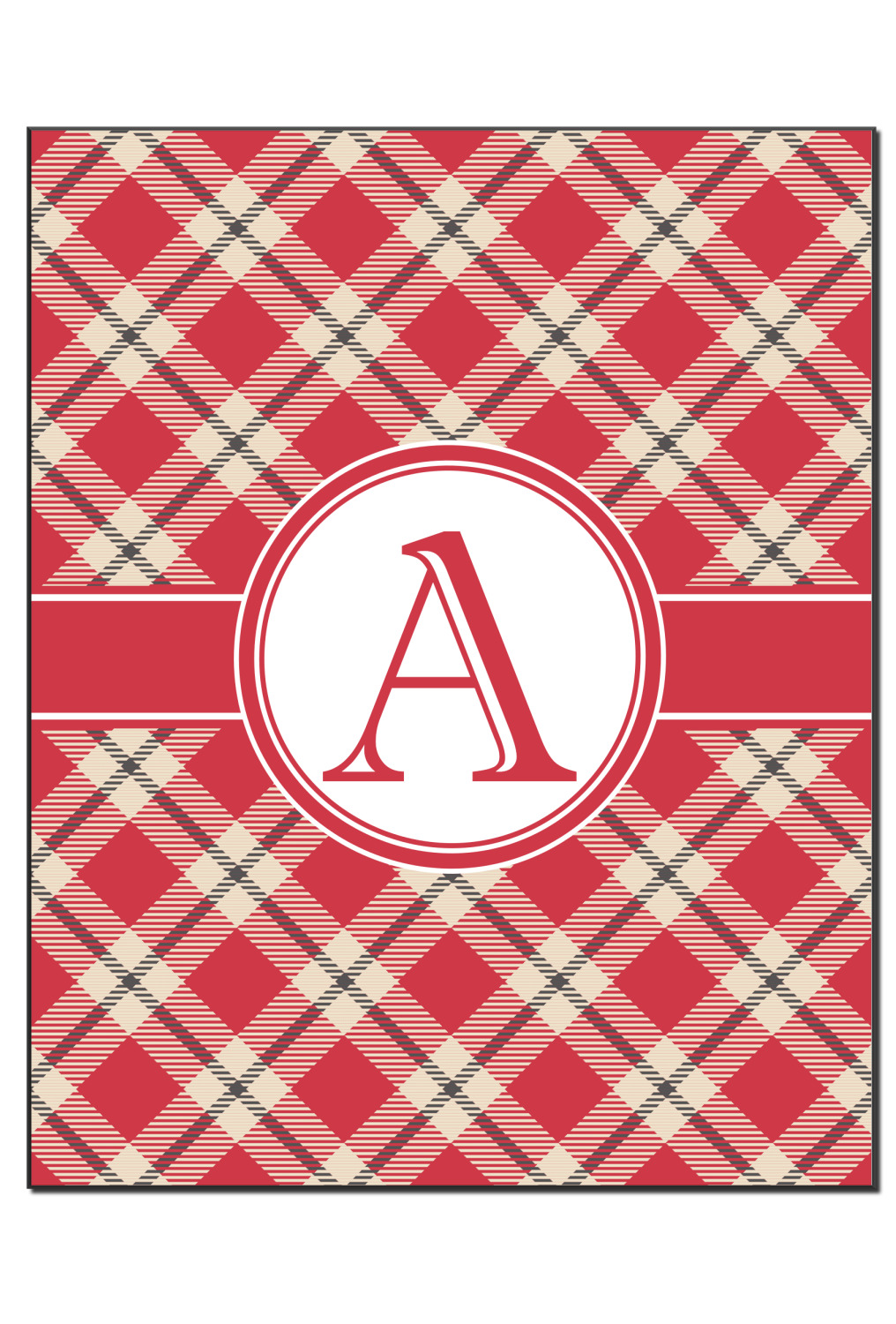 For our design, we chose a simple plaid; we chose red & tan to create a unisex palette and used dark grey for our accent color. We also chose the classic ribbon and round label with an elegant initial for our very simple, yet elegant personalization.