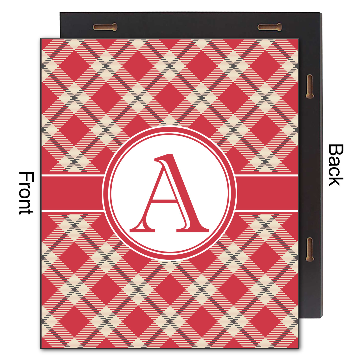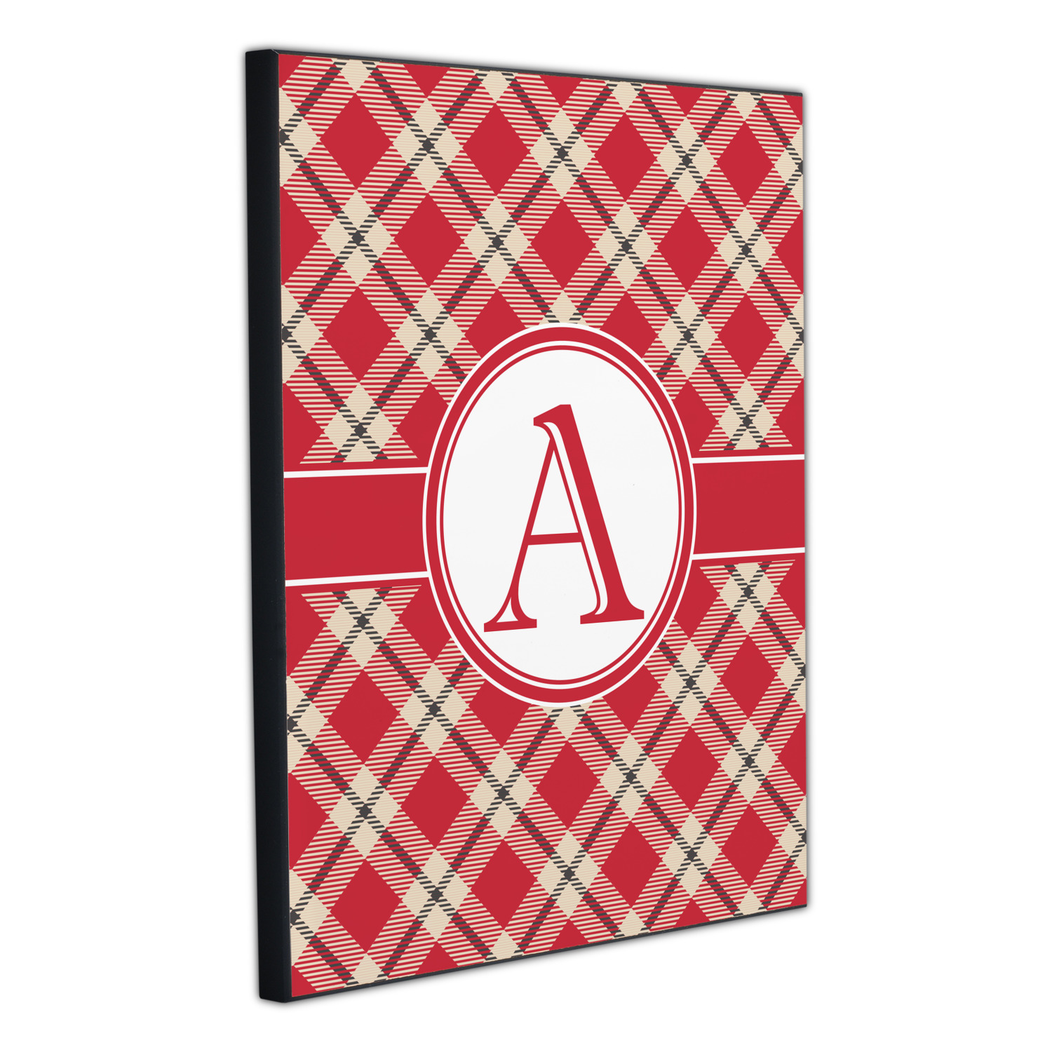 For our design, we chose a simple plaid; we chose red & tan to create a unisex palette and used dark grey for our accent color. We also chose the classic ribbon and round label with an elegant initial for our very simple, yet elegant personalization.