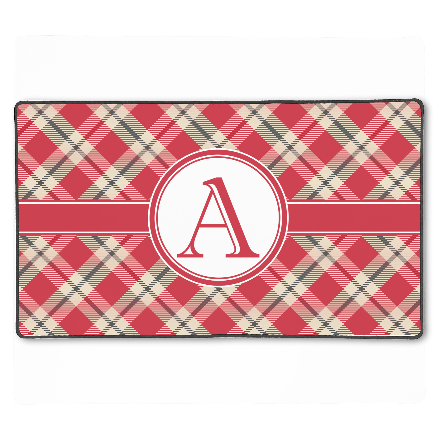 For our design, we chose a simple plaid; we chose red & tan to create a unisex palette and used dark grey for our accent color. We also chose the classic ribbon and round label with an elegant initial for our very simple, yet elegant personalization.