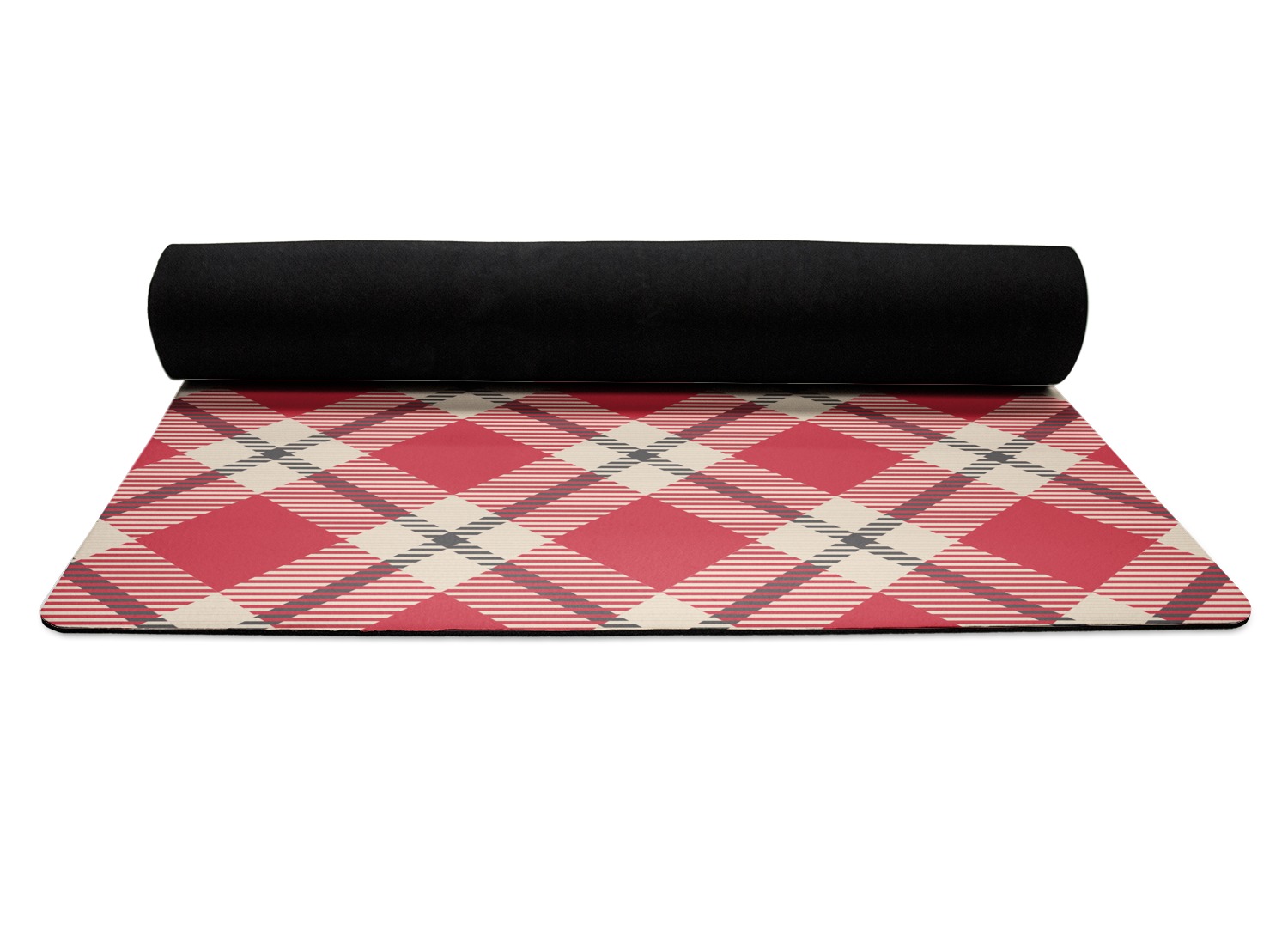 The top of the mats are dyed with your design using eco friendly non solvent inks. They have a smooth fleece felt top and feels very soft. The back of the mat is a sleek black and is a squishy non-slip texture to ensure that your mat does not slip on the floor. Our rubber backed mats are the perfect size at 68" x 24" and are just under approximately 1/4 inch thickness.