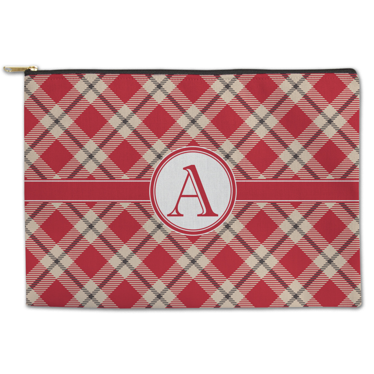 For our design, we chose a simple plaid; we chose red & tan to create a unisex palette and used dark grey for our accent color. We also chose the classic ribbon and round label with an elegant initial for our very simple, yet elegant personalization.