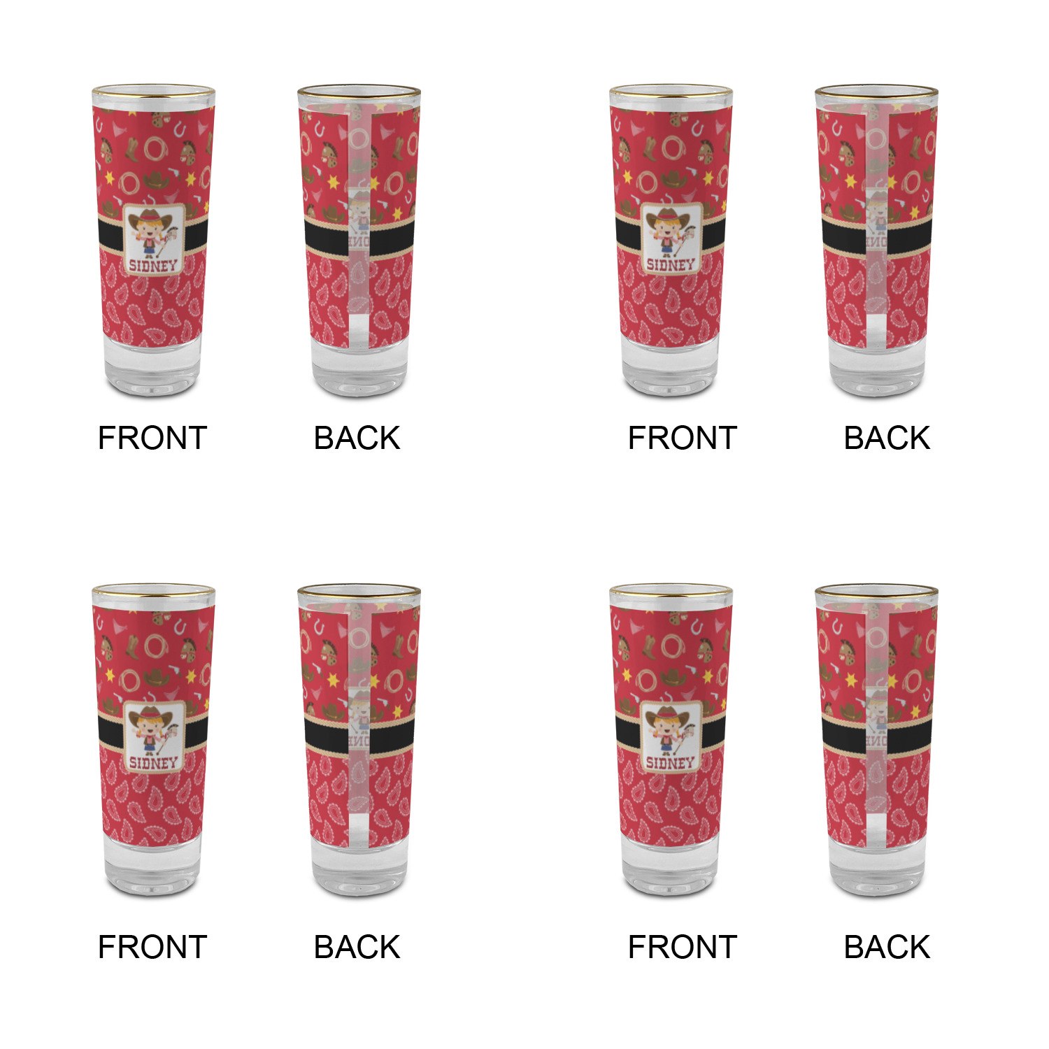 These glass shooter glasses are printed in full color with the design of your choice. These are a tall shooter 2 oz size and stand 4" tall. The print is a full wrap design to boldly display your personalization.