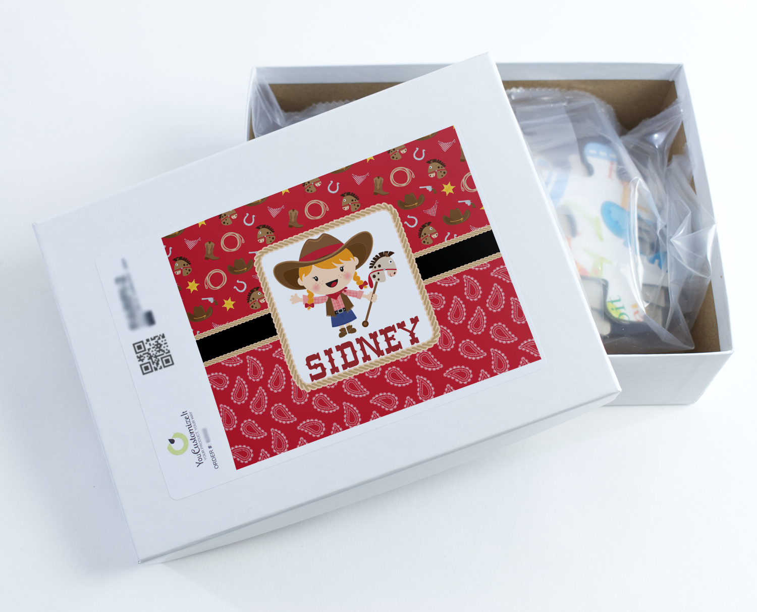 A rope outlined square label showcasing our cute little cowgirl holding her trick pony and lasso has your little one dreaming of riding the range one day.