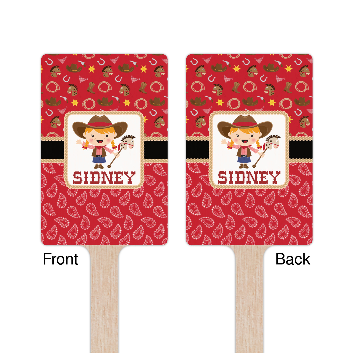A rope outlined square label showcasing our cute little cowgirl holding her trick pony and lasso has your little one dreaming of riding the range one day.