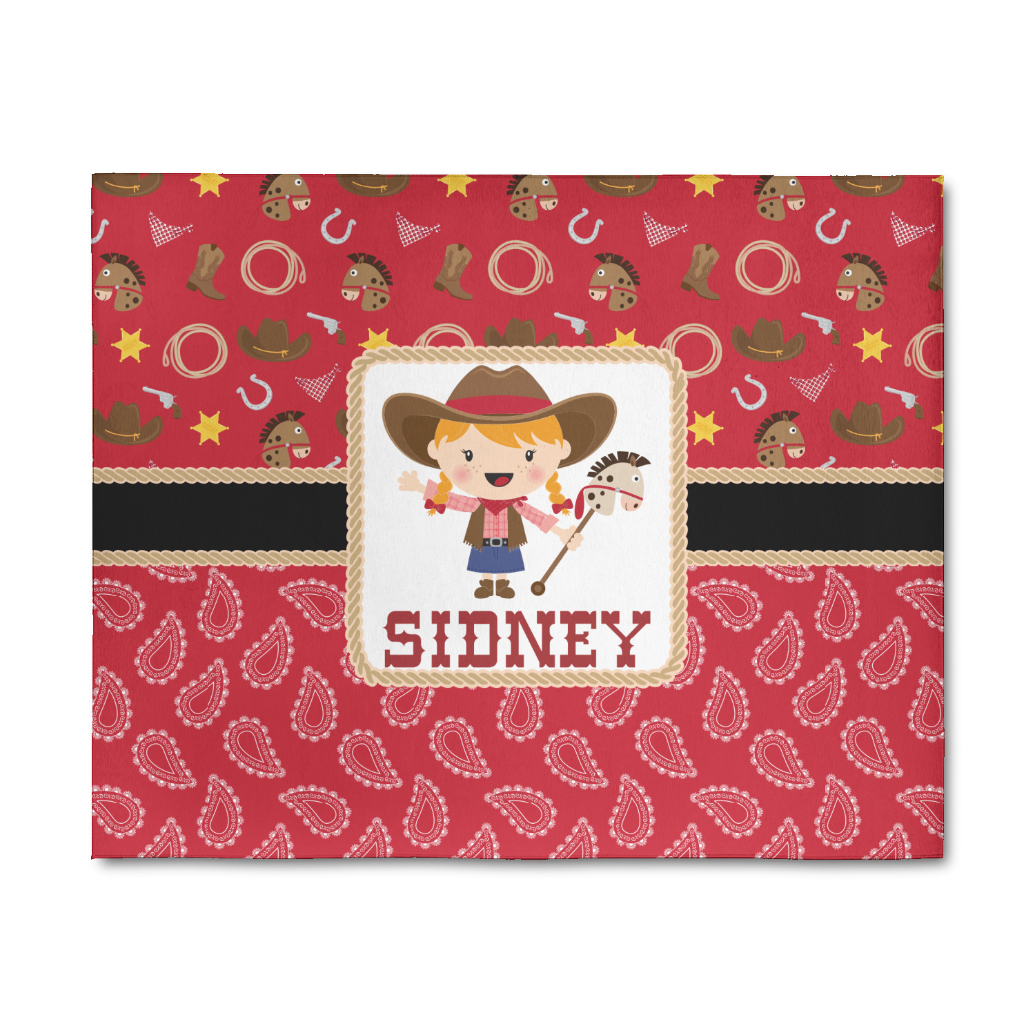 Howdy Y'all! What little country girl wouldn't want to be surrounded by this cute Western theme design? Set on a backdrop of red, the horses, cowboy boots and hats, rope, guns, Sheriff badges, and bandannas set the scene for a hoedown every day. A coordinating red gingham pattern on the bottom tie the entire design together. A wide band of red trimmed in rope add that special touch of design.