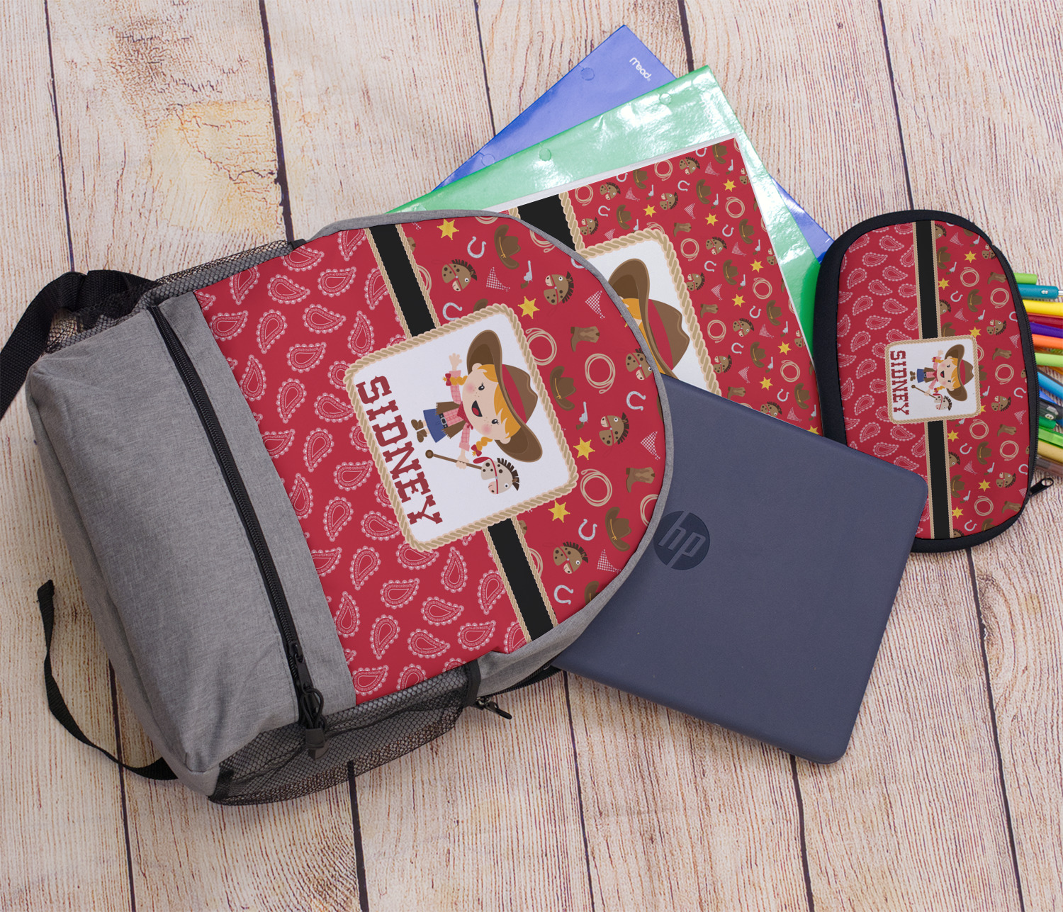 A rope outlined square label showcasing our cute little cowgirl holding her trick pony and lasso has your little one dreaming of riding the range one day.