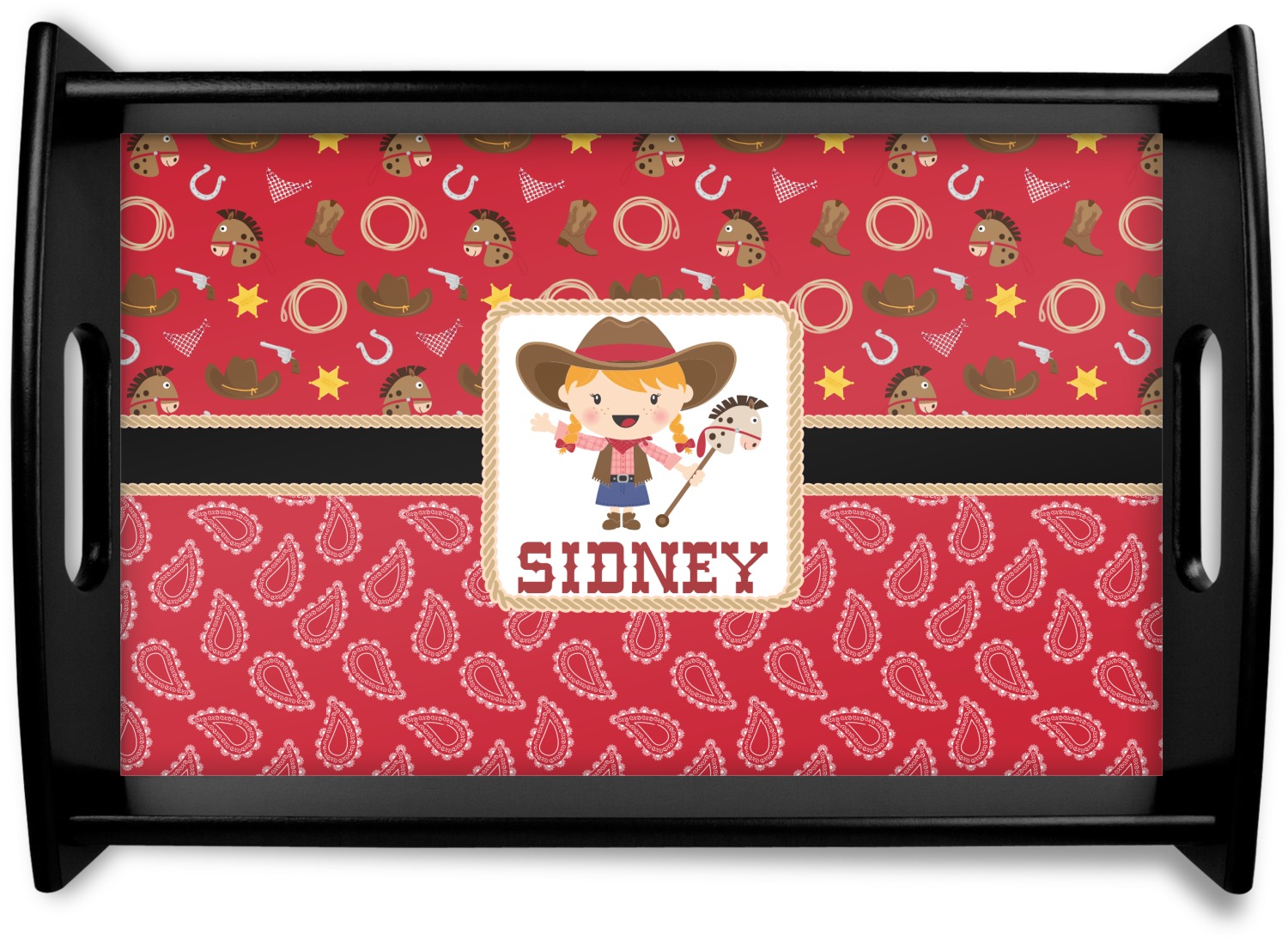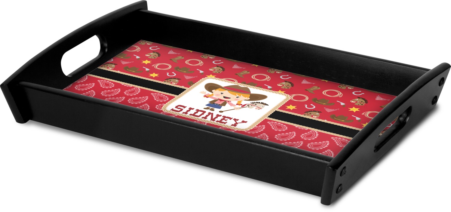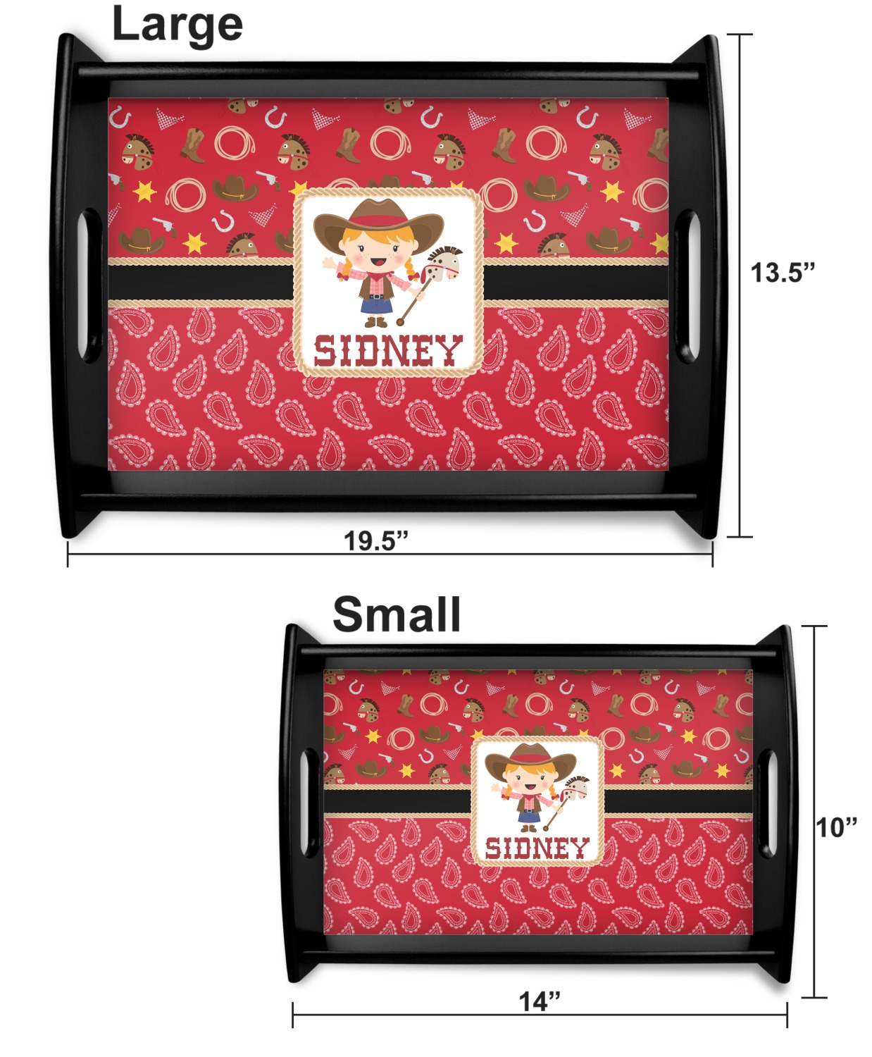 This serving tray with handles features square edges and two rounded sides, creating a very modern look. Each side is fabricated from a beautifully cut, natural wood. The bottom of the interior of the tray displays your customized design in bright, vibrant color. The tray is sold in both a black color and a natural wood look. Each variation of the wood serving tray has two sizes: Small, which is 14" x 10" x 2.25", and Large, which is 19.5" x 13.5" x 2.75".