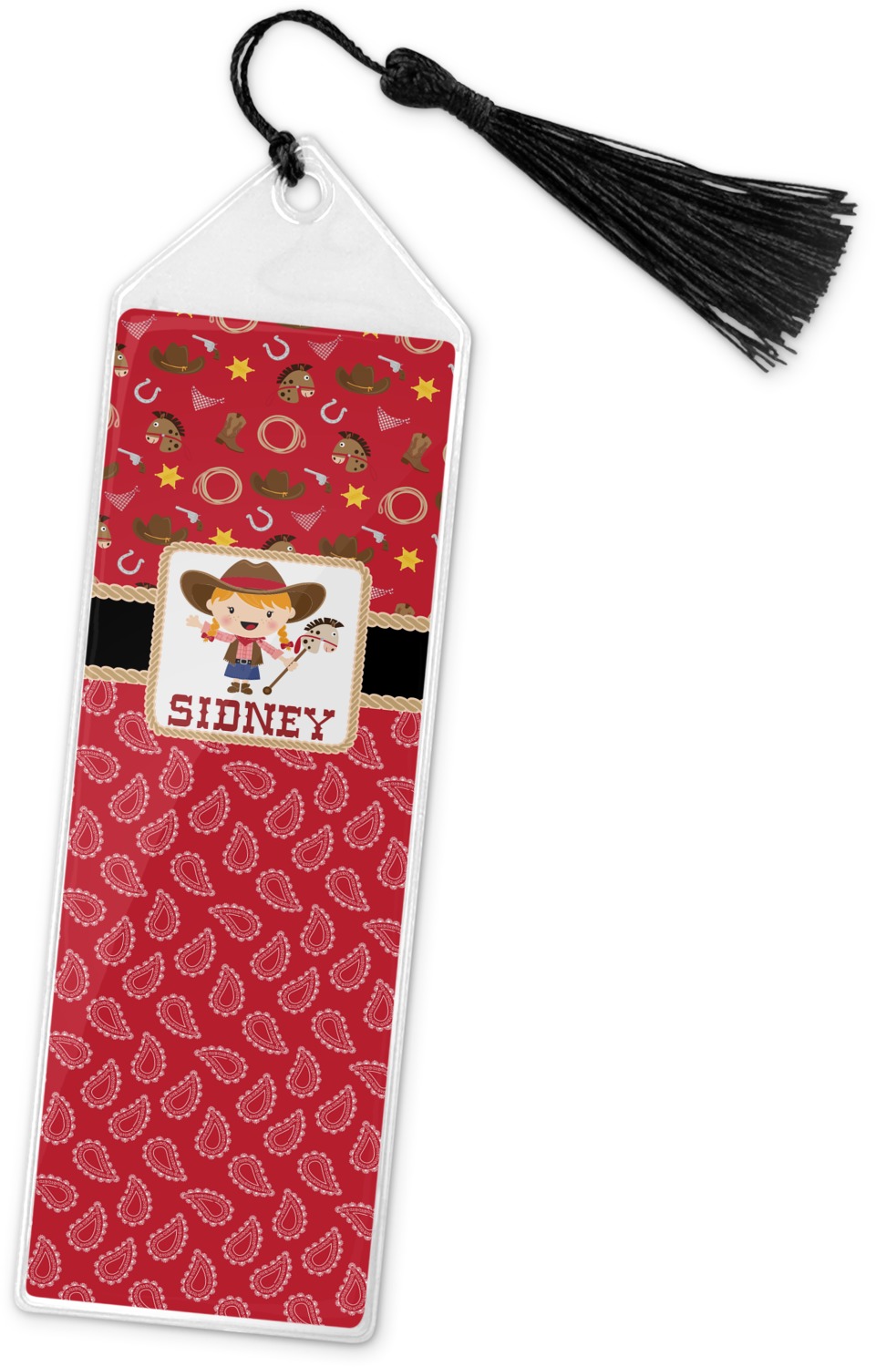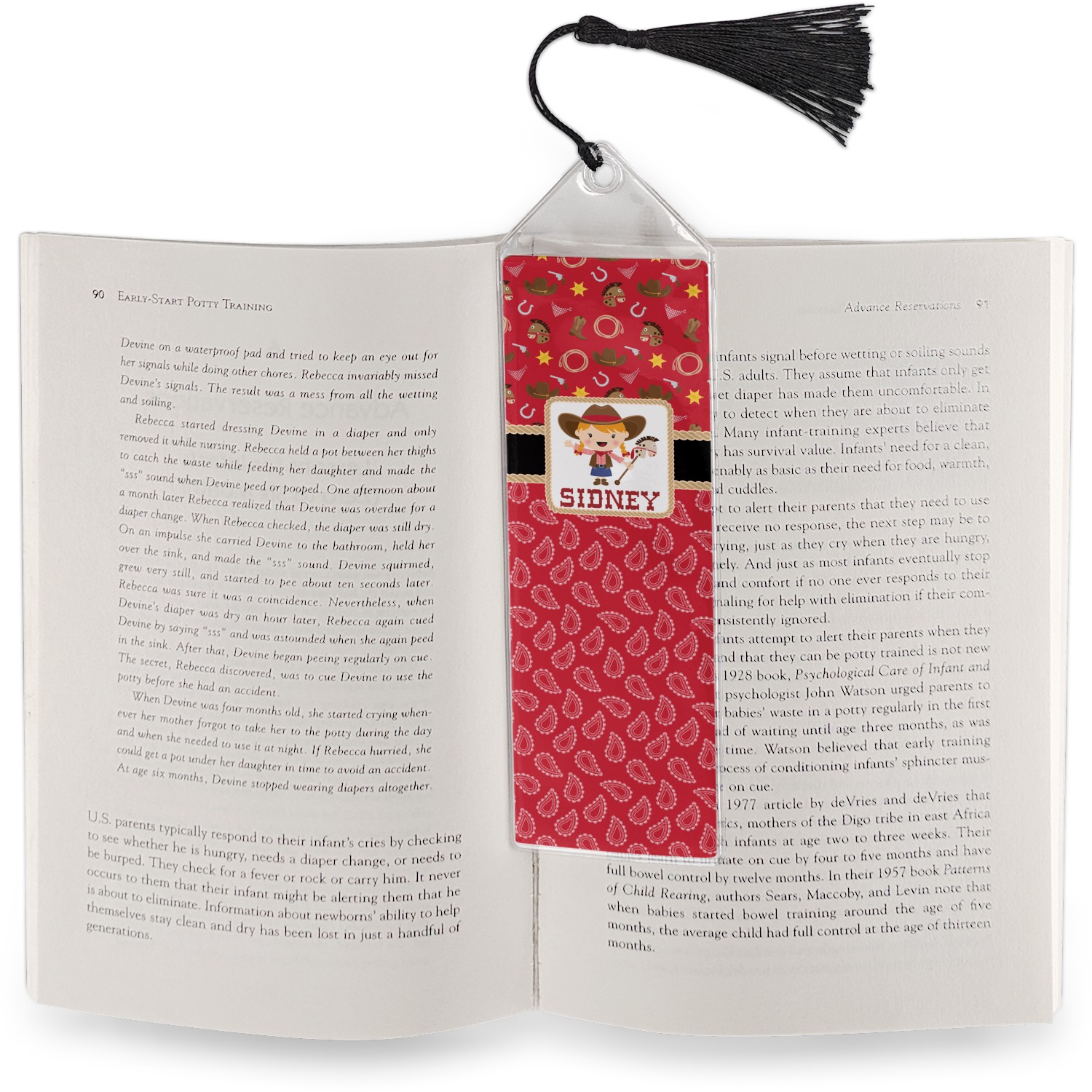 Your personalized bookmark is made of a sturdy, clear vinyl, and is approximately 7.5" x 2.25". We display your personalization on vinyl inserts that are placed on both sides. Accompanying each book marker is a black, fringe tassel that attaches to the reinforced, triangular header.