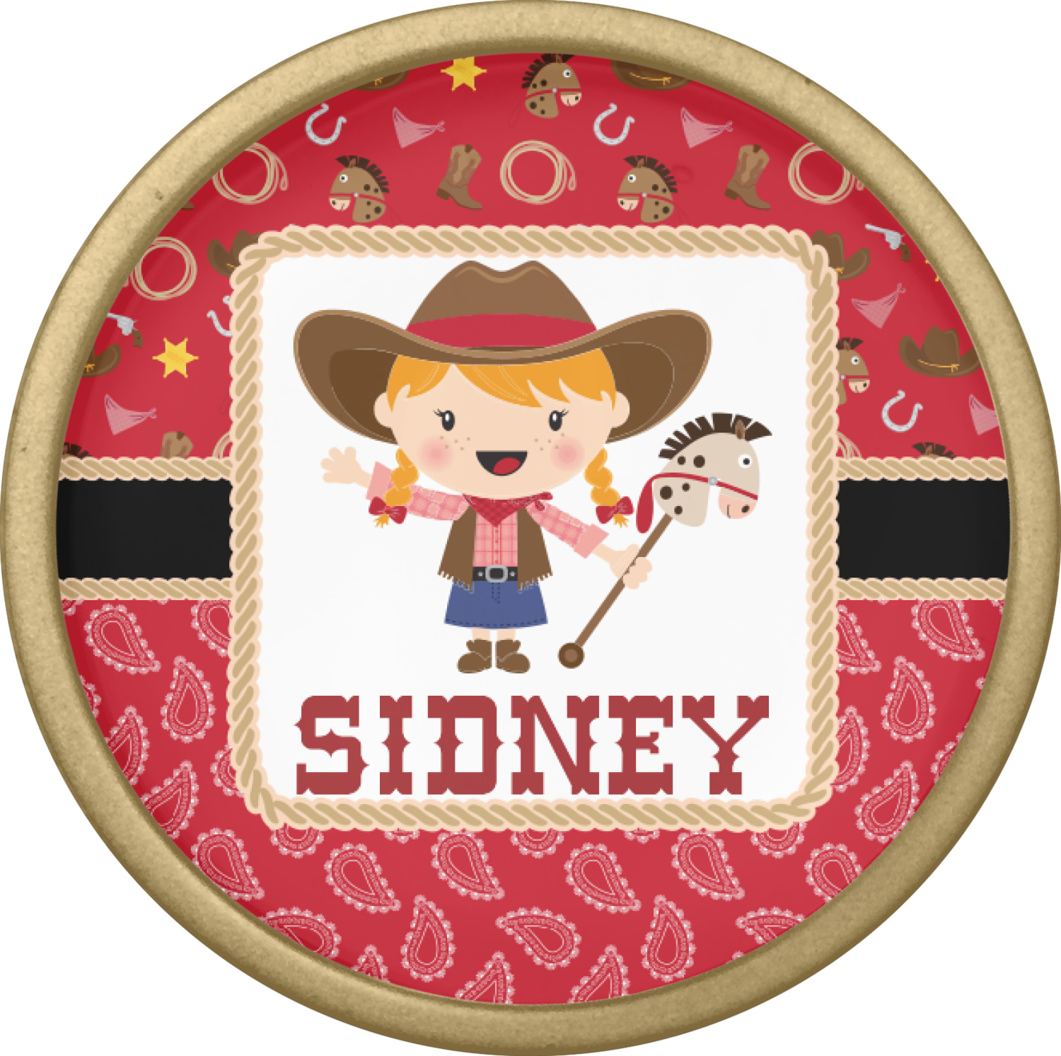 A rope outlined square label showcasing our cute little cowgirl holding her trick pony and lasso has your little one dreaming of riding the range one day.
