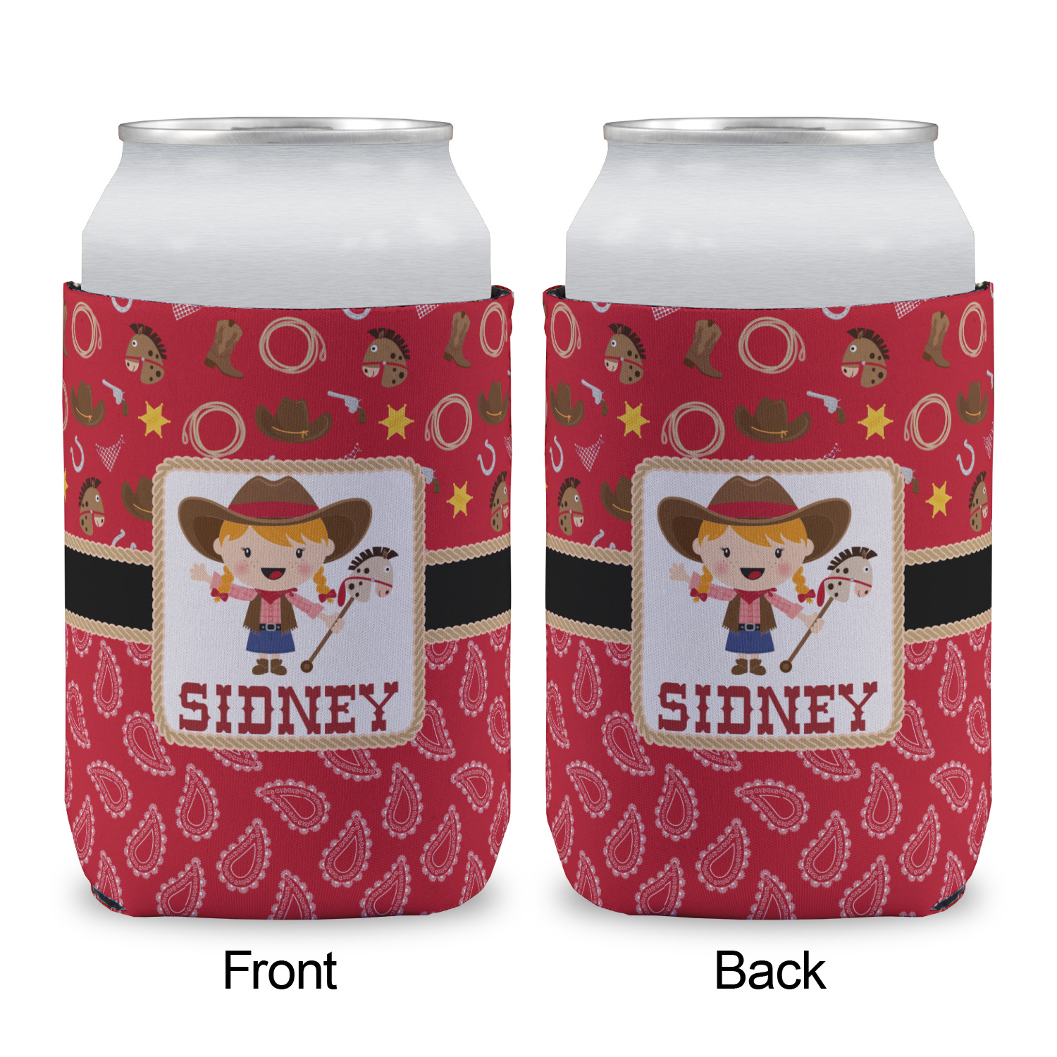 A rope outlined square label showcasing our cute little cowgirl holding her trick pony and lasso has your little one dreaming of riding the range one day.