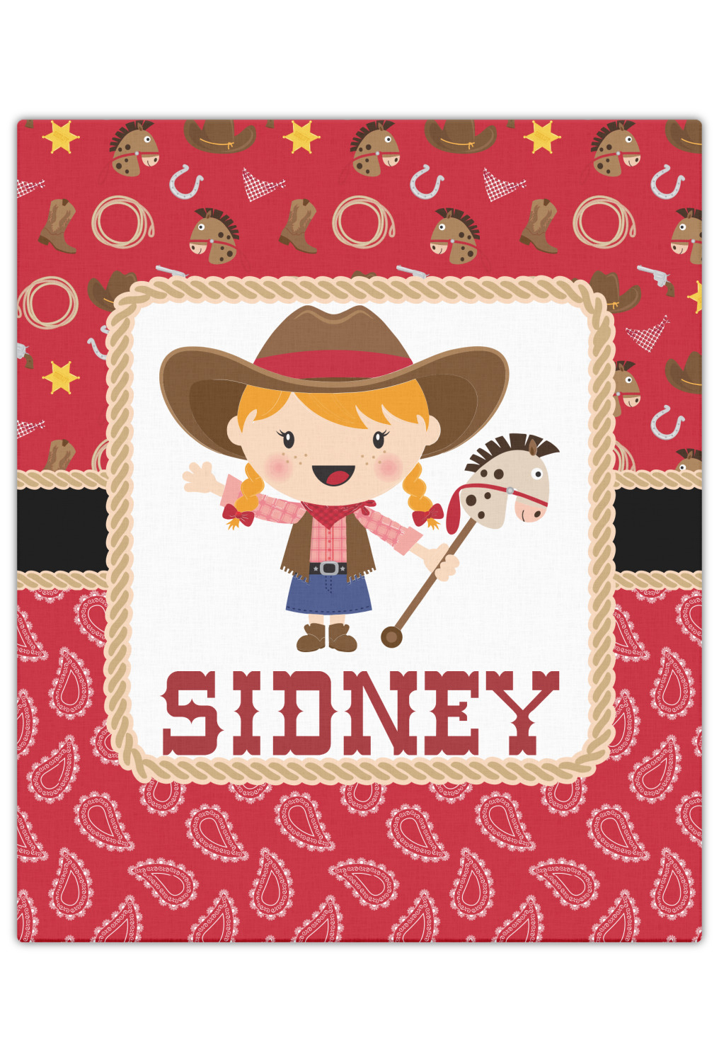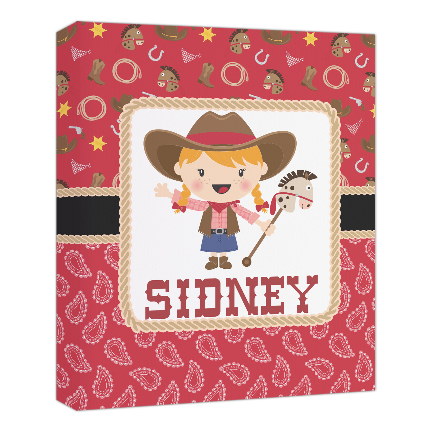 A rope outlined square label showcasing our cute little cowgirl holding her trick pony and lasso has your little one dreaming of riding the range one day.