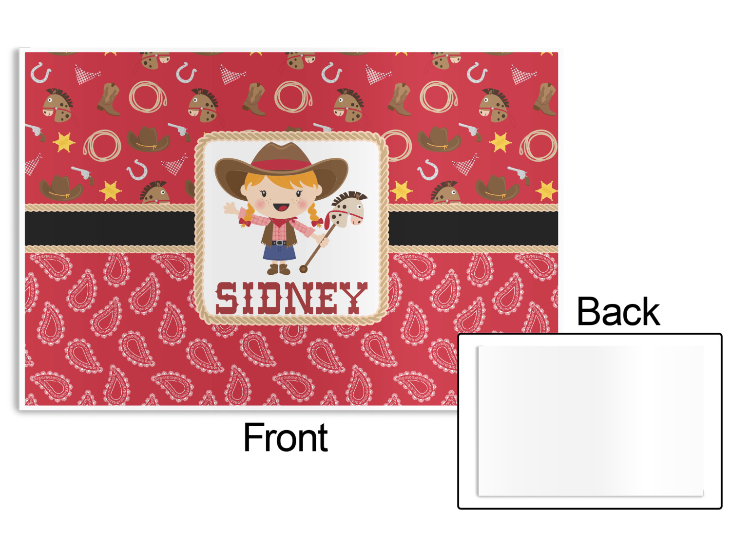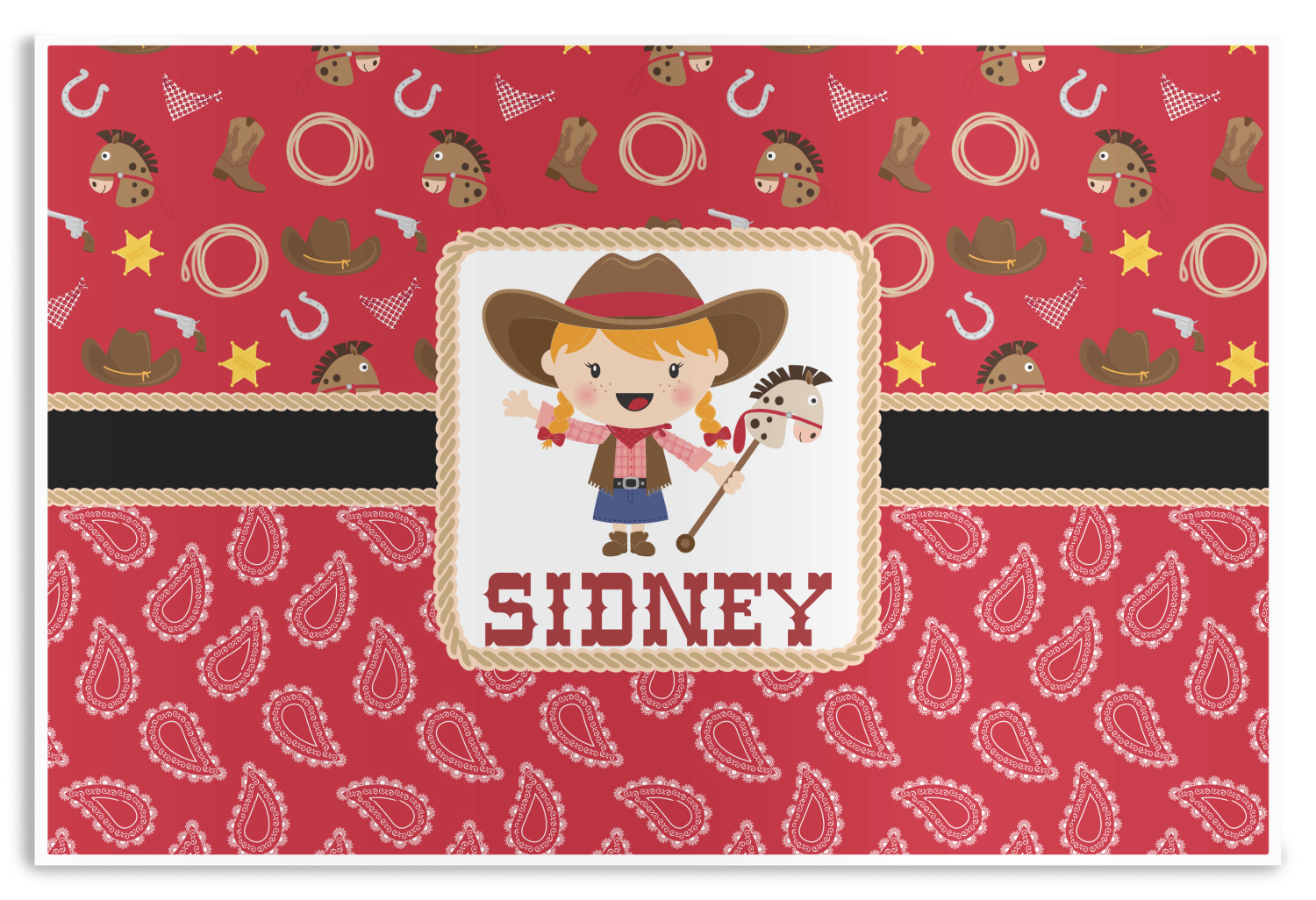 A rope outlined square label showcasing our cute little cowgirl holding her trick pony and lasso has your little one dreaming of riding the range one day.