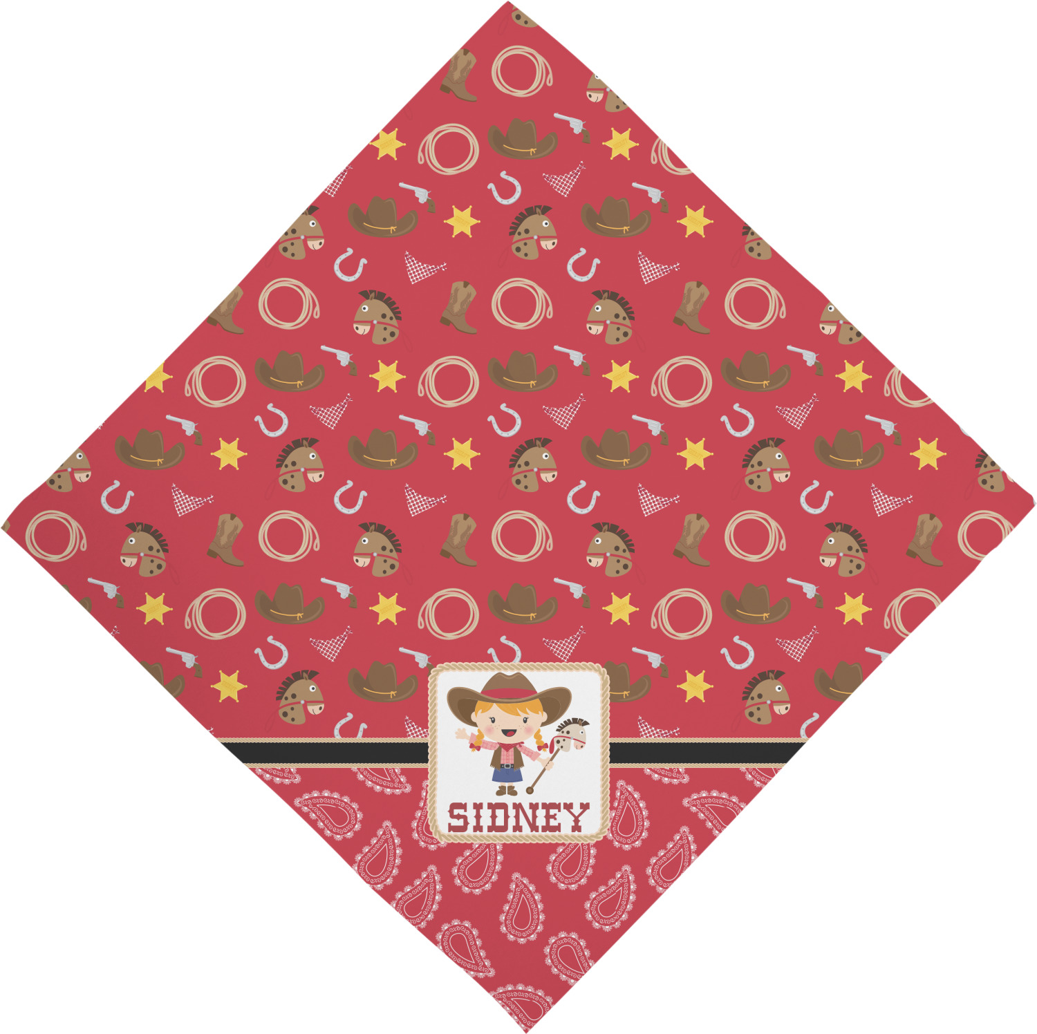 Howdy Y'all! What little country girl wouldn't want to be surrounded by this cute Western theme design? Set on a backdrop of red, the horses, cowboy boots and hats, rope, guns, Sheriff badges, and bandannas set the scene for a hoedown every day. A coordinating red gingham pattern on the bottom tie the entire design together. A wide band of red trimmed in rope add that special touch of design.