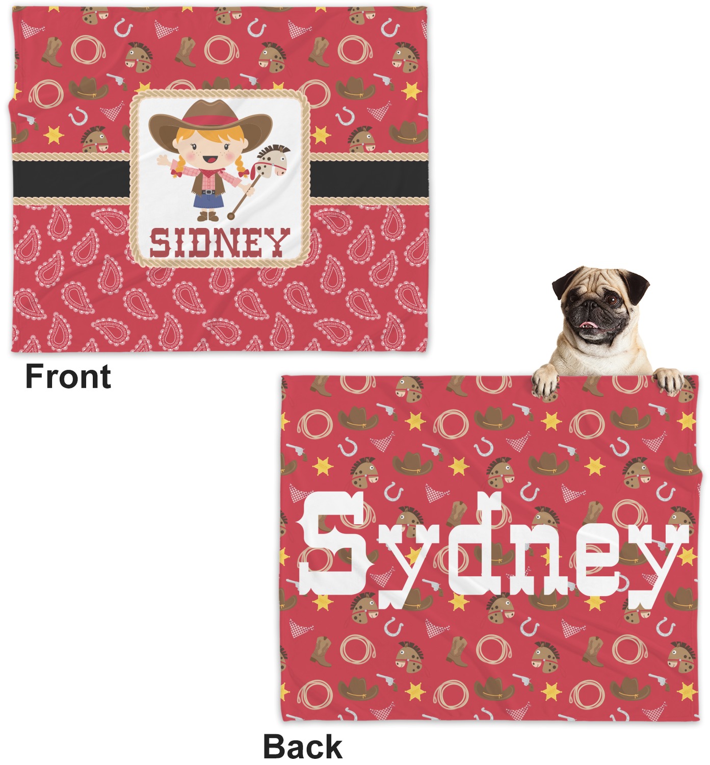 These dog blankets are crafted from a gentle, soft-to-the-touch, minky material. We print your customizations, either matching or differing, on both the top and underside of the blanket. These personalized dog blankets are available in two sizes: regular and large. Our regular size, at 40" x 30", accommodates small and some medium size dogs. At 60" x 50", our large dog blanket is a better fit for bigger breeds. Though specialized for dogs, these blankets still make a thoughtful gift for your favorite feline, or any other pet in mind!