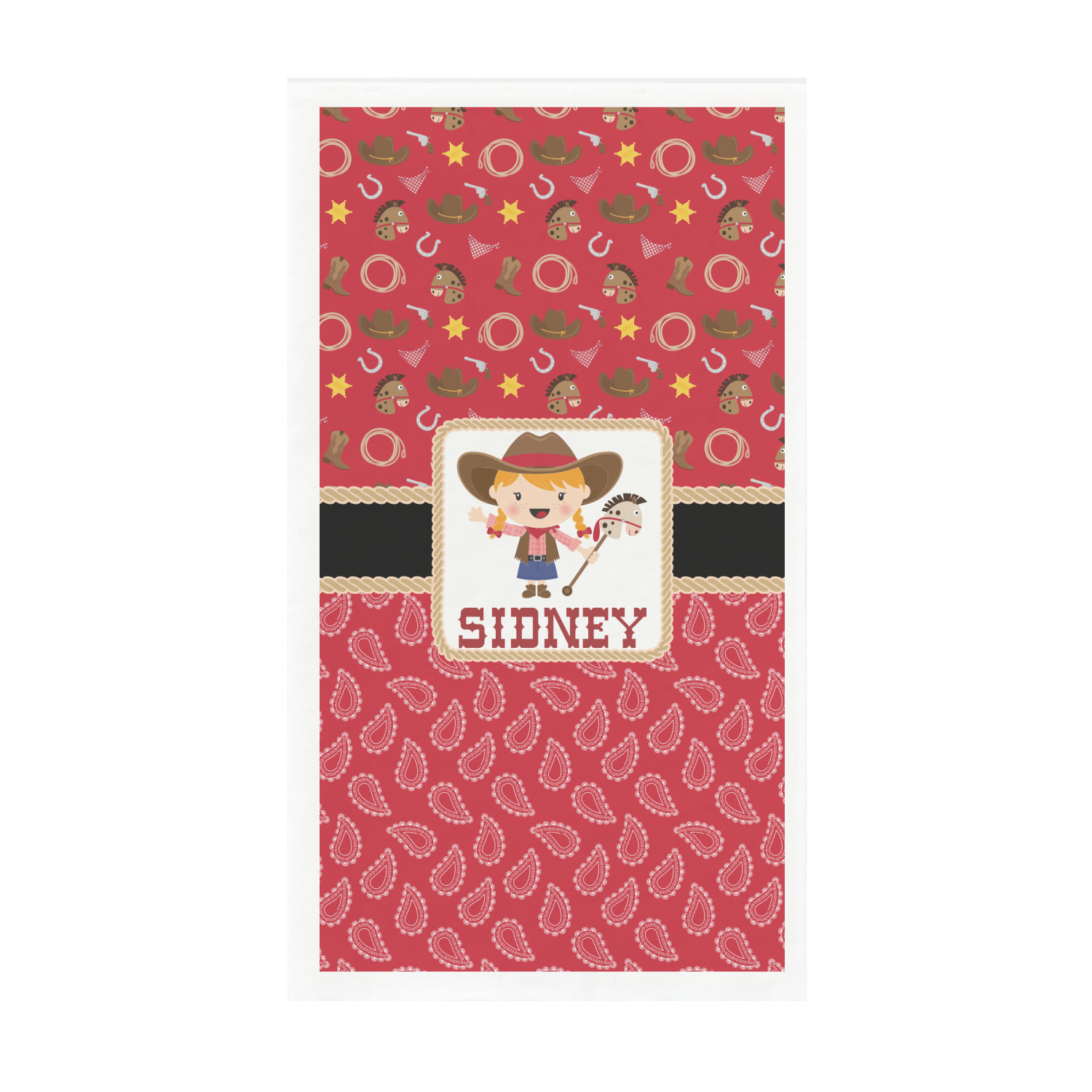A rope outlined square label showcasing our cute little cowgirl holding her trick pony and lasso has your little one dreaming of riding the range one day.