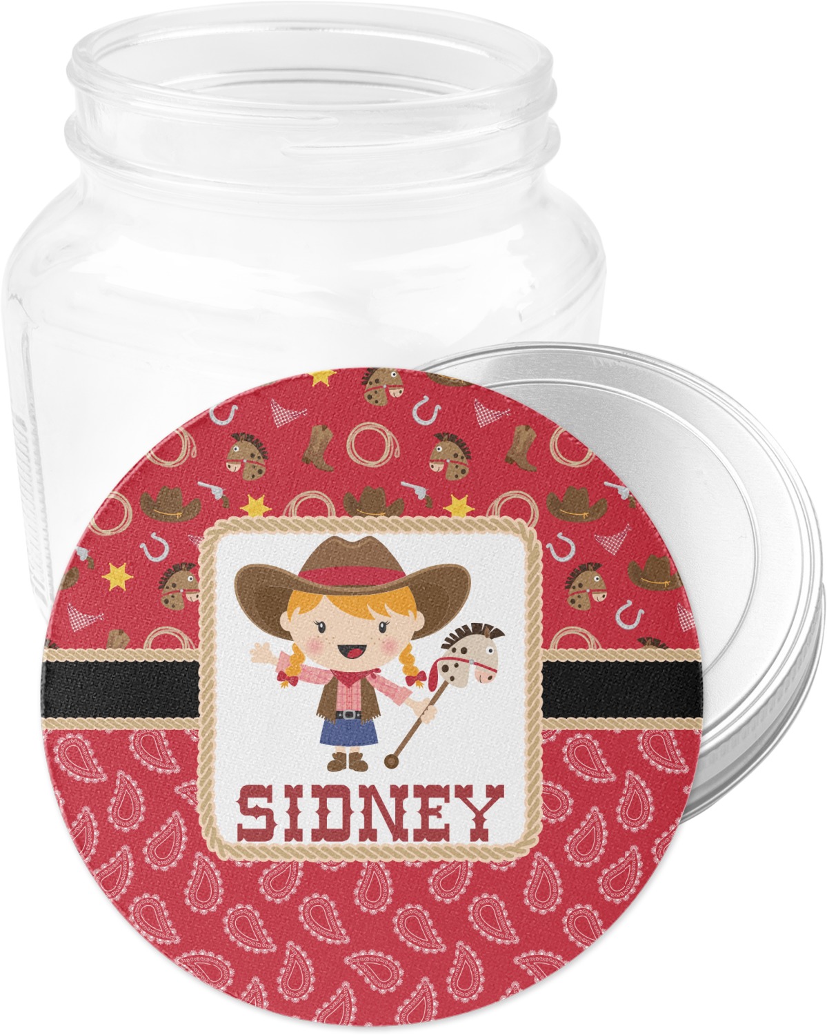 A rope outlined square label showcasing our cute little cowgirl holding her trick pony and lasso has your little one dreaming of riding the range one day.