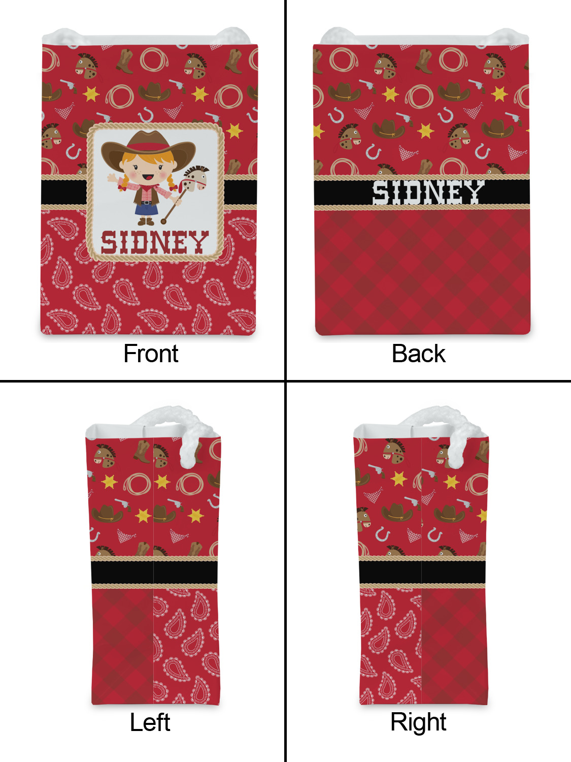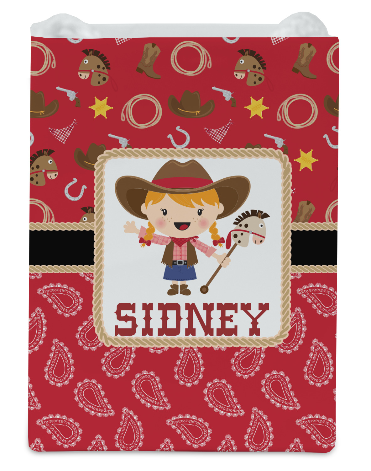 Howdy Y'all! What little country girl wouldn't want to be surrounded by this cute Western theme design? Set on a backdrop of red, the horses, cowboy boots and hats, rope, guns, Sheriff badges, and bandannas set the scene for a hoedown every day. A coordinating red gingham pattern on the bottom tie the entire design together. A wide band of red trimmed in rope add that special touch of design.