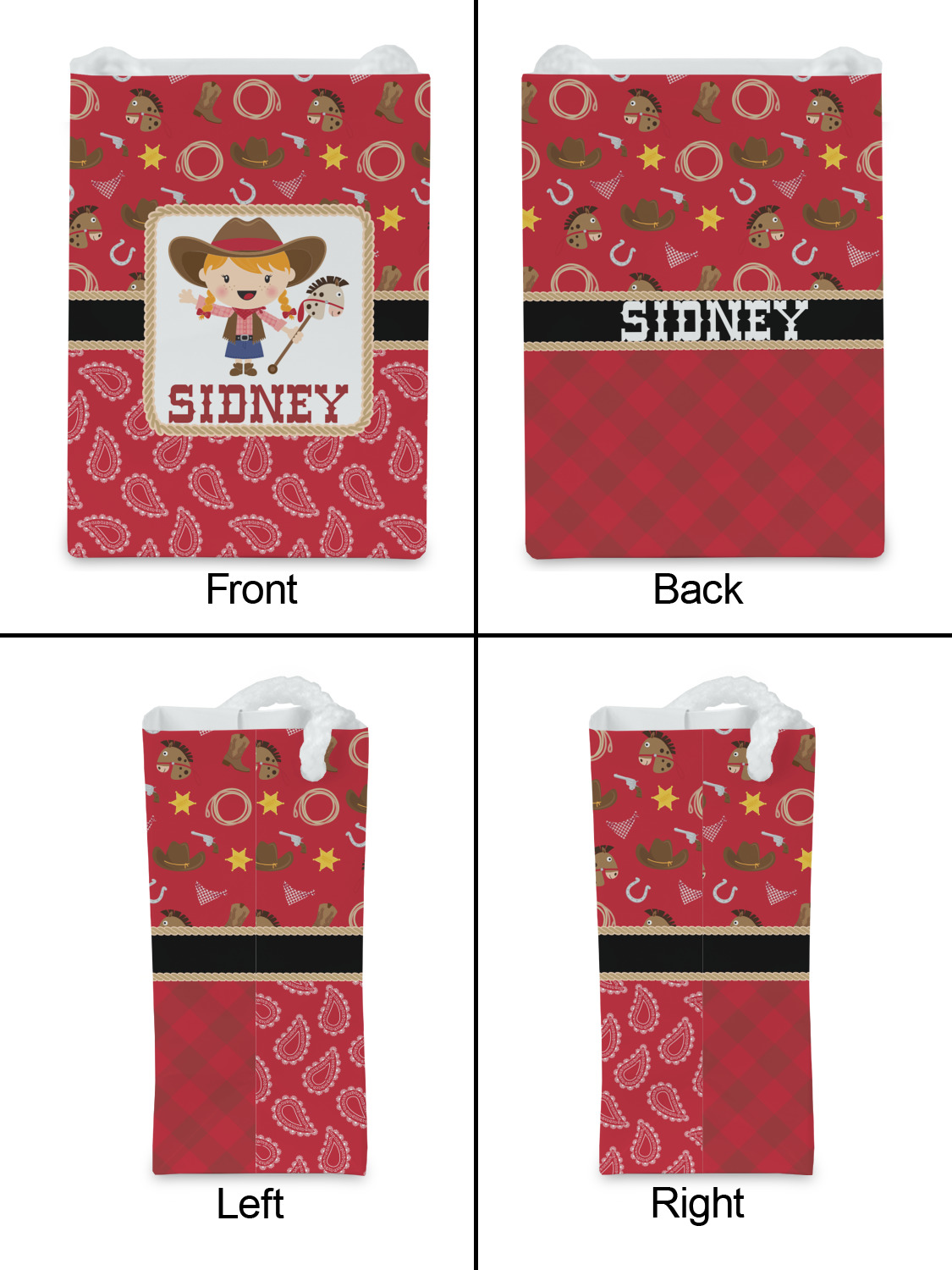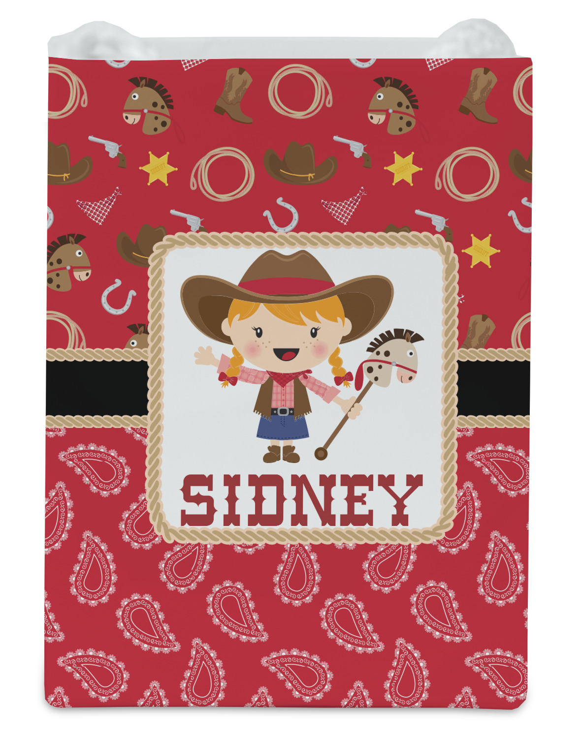 A rope outlined square label showcasing our cute little cowgirl holding her trick pony and lasso has your little one dreaming of riding the range one day.