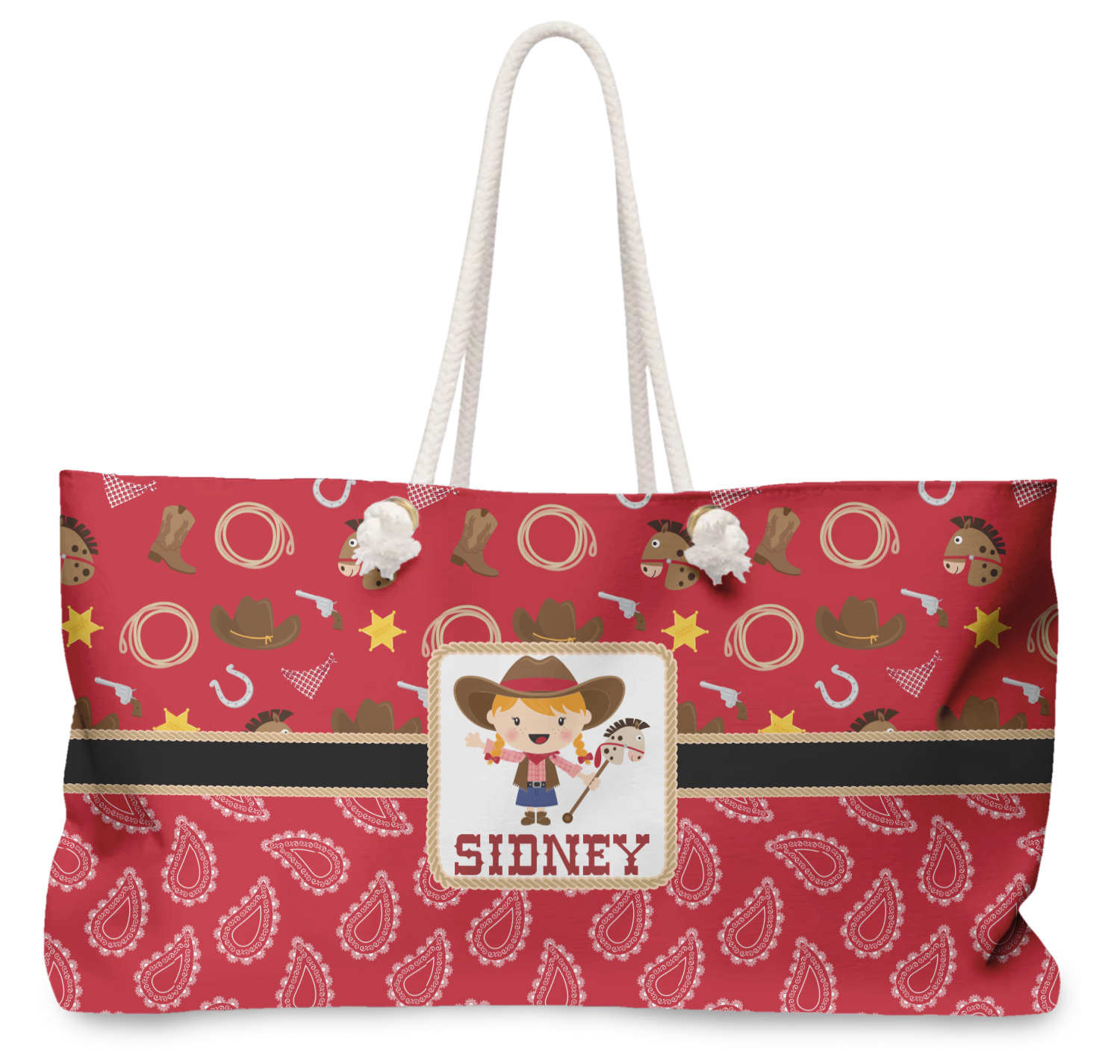 Our oversized weekender tote with rope handles is perfect for your weekend at the beach or on the town. This large tote are 24" W X 13" H, with a 5" gusset and a 27" thick rope handles with a knot that is put through a grommeted brass hole.