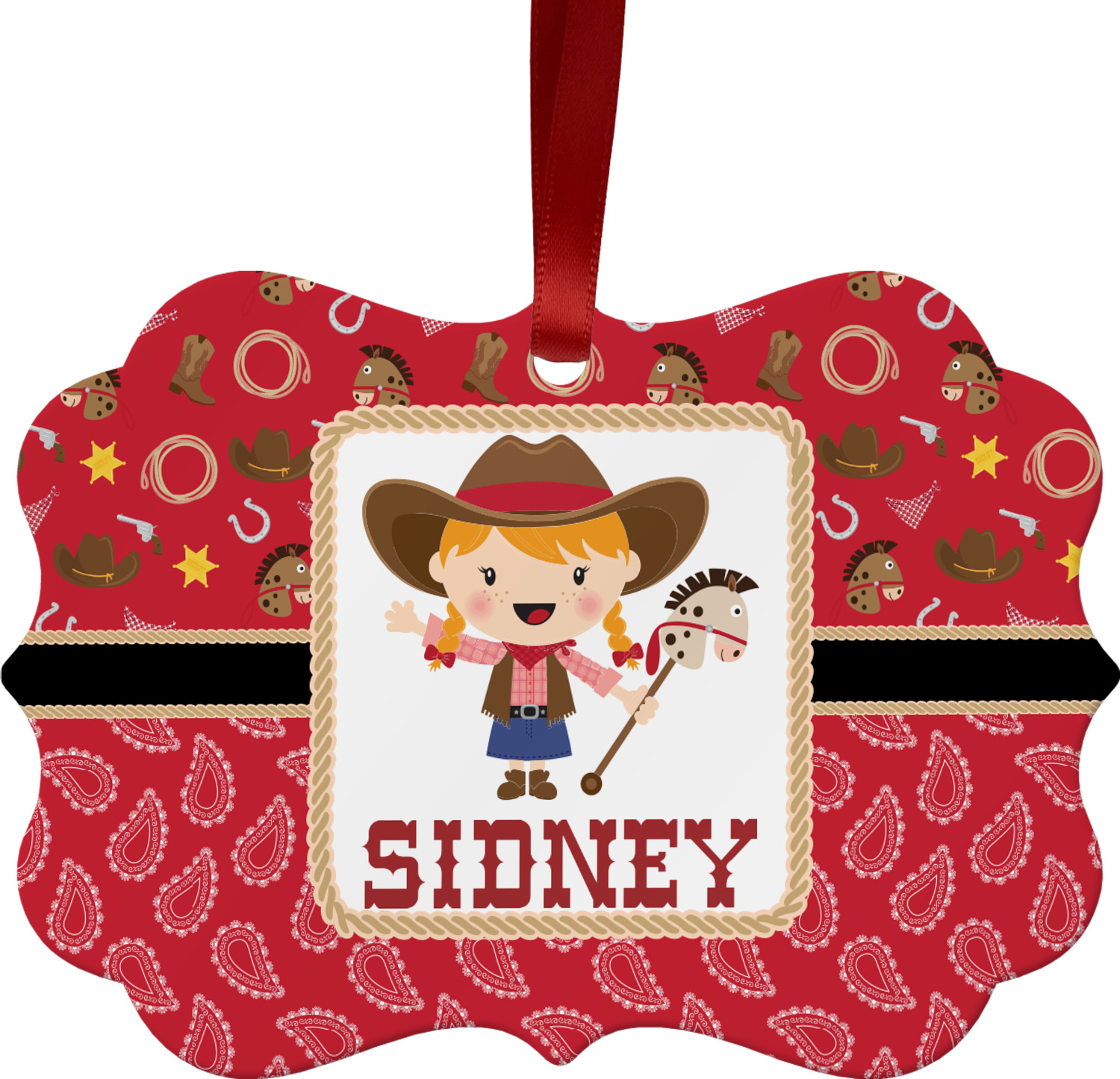 A rope outlined square label showcasing our cute little cowgirl holding her trick pony and lasso has your little one dreaming of riding the range one day.