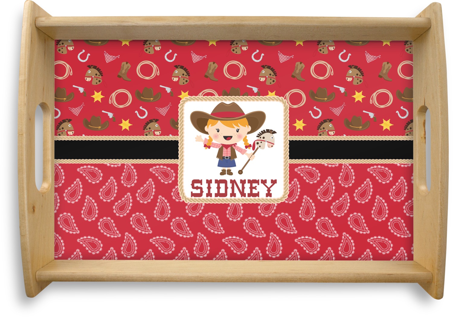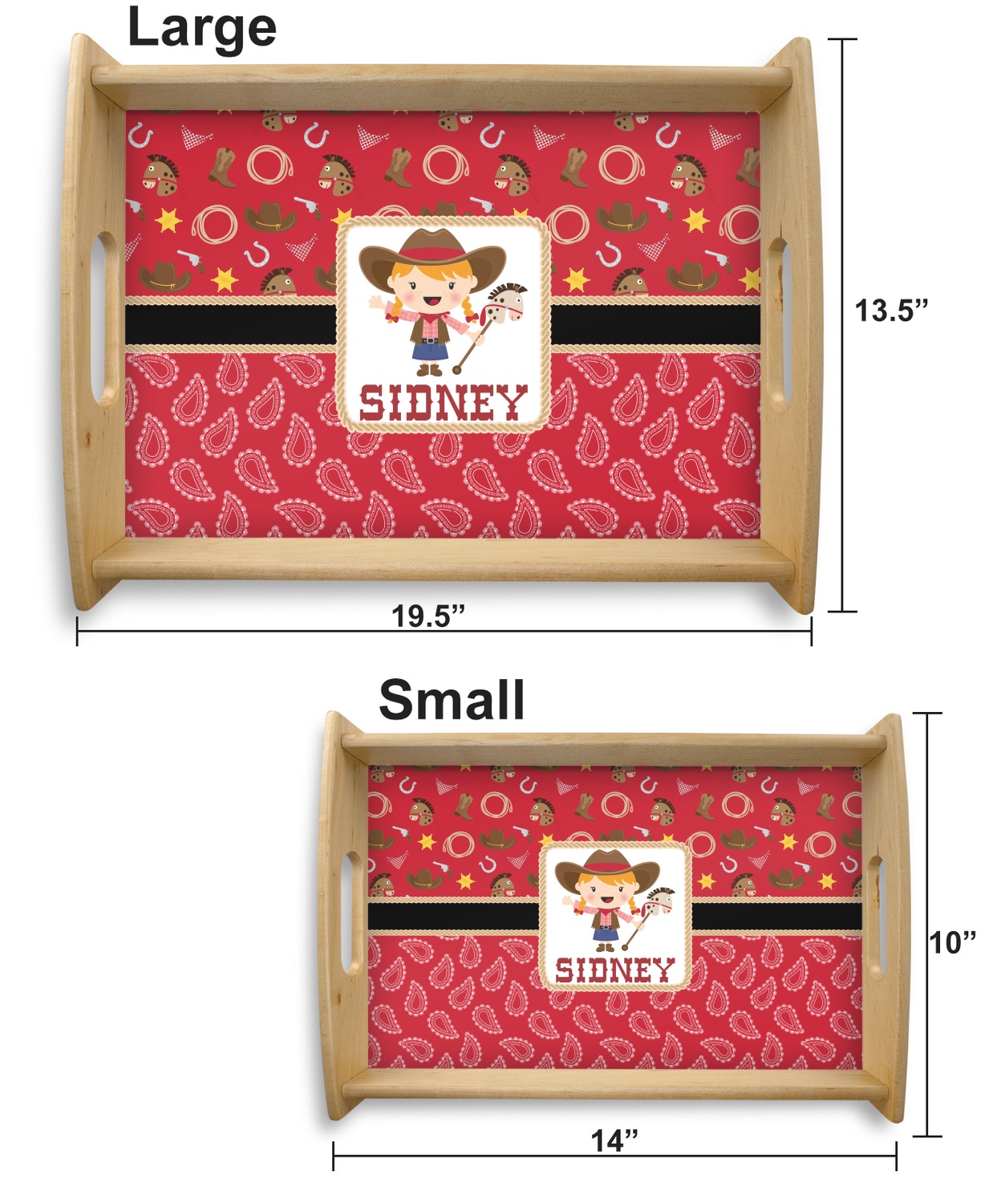 This serving tray with handles features square edges and two rounded sides, creating a very modern look. Each side is fabricated from a beautifully cut, natural wood. The bottom of the interior of the tray displays your customized design in bright, vibrant color. The tray is sold in both a black color and a natural wood look. Each variation of the wood serving tray has two sizes: Small, which is 14" x 10" x 2.25", and Large, which is 19.5" x 13.5" x 2.75".