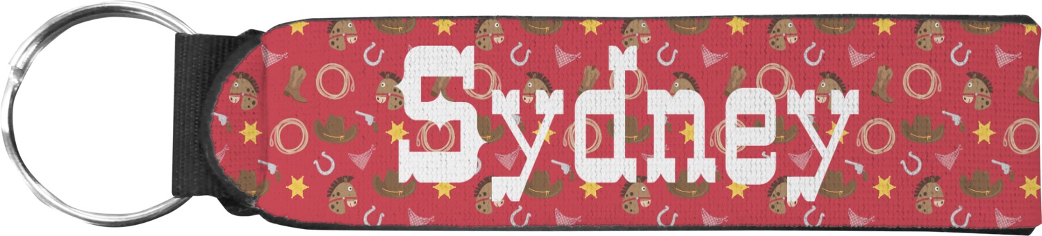 Made from neoprene, these key fob wristlets are comfortable, cushioned, easy to slip on and off; these traits allow it to maintain a slim, yet fashionable appearance, all while optimizing your efficiency. When attaching or removing keys, simply squeeze open the included metal ring. These fobs measure at around 4 inches, and have a bit of a stretch. Thus, they are best suited for small to medium size wrists. If you require a larger size, check out our webbing keychain fob for larger sizing.
