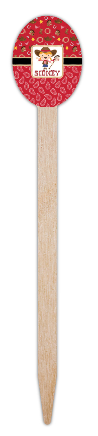 A rope outlined square label showcasing our cute little cowgirl holding her trick pony and lasso has your little one dreaming of riding the range one day.