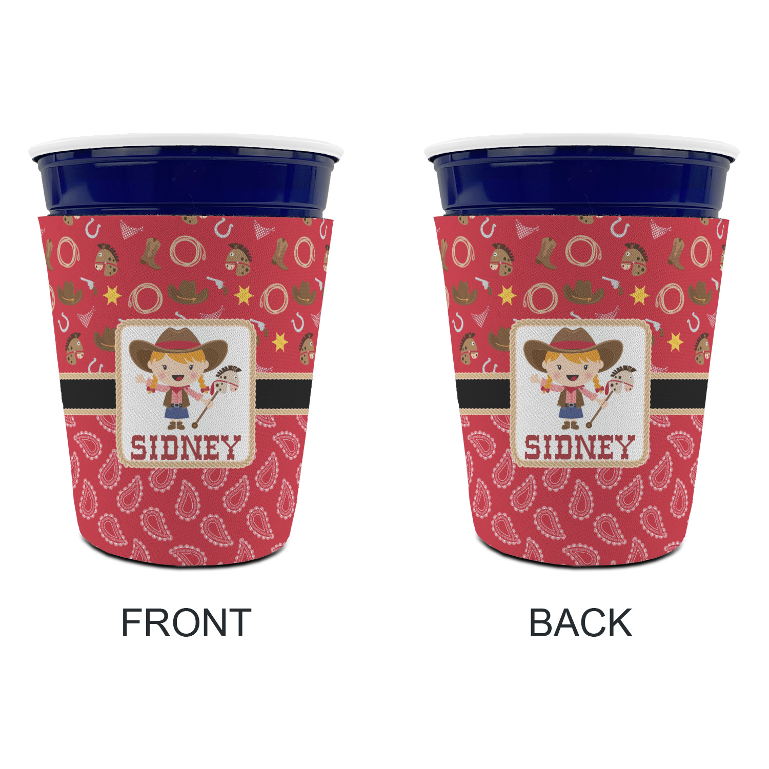 Made from neoprene with a polyester outer fabric and sewn seams, these premium quality party cup sleeves are very durable and will hold up to heavy use. They are available in 2 styles - with a bottom or just a sleeve to go around the outside of the tapered cup. The sleeve covers are about 4" tall and cover about 90% of the classic 16 oz. Solo cup.