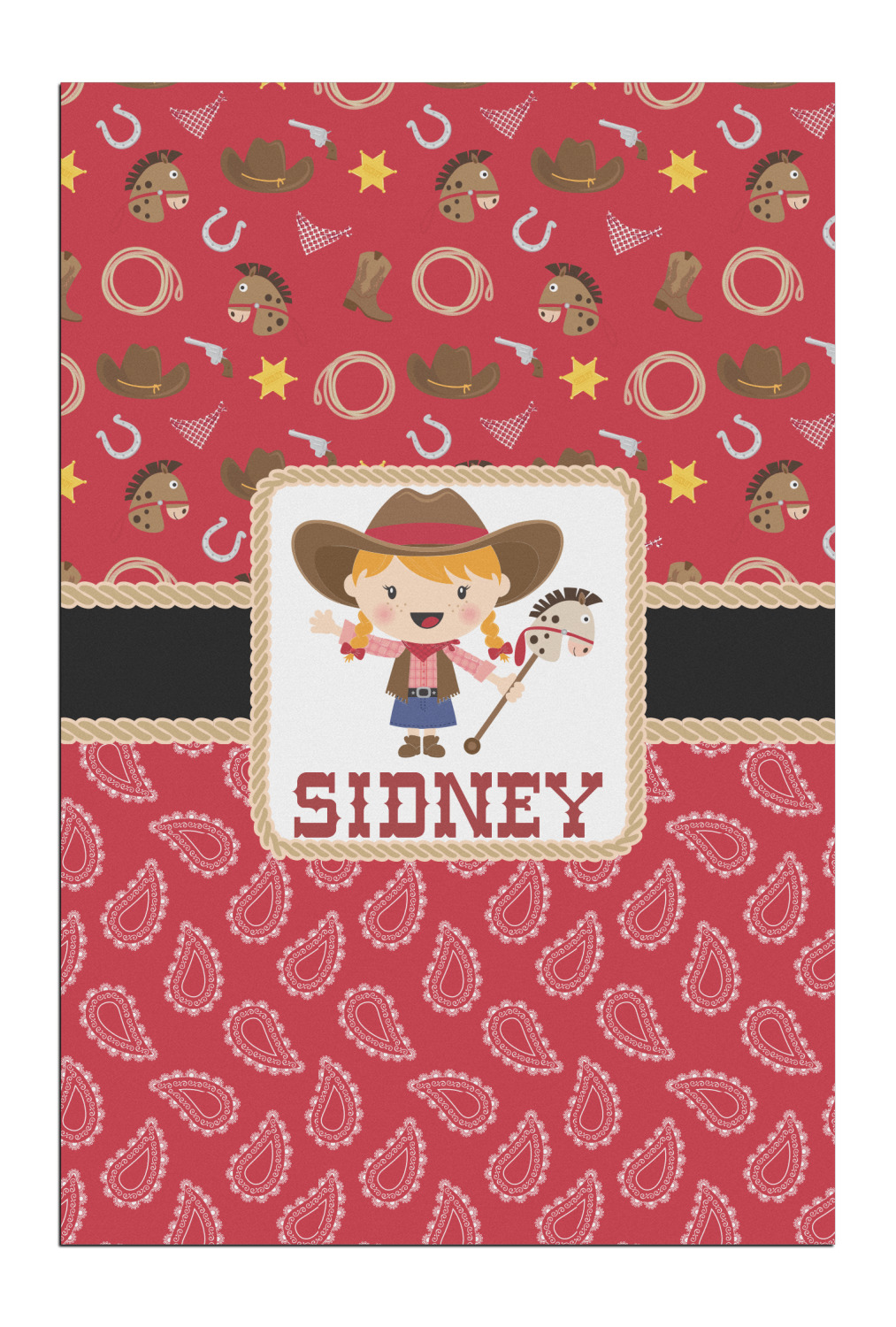 A rope outlined square label showcasing our cute little cowgirl holding her trick pony and lasso has your little one dreaming of riding the range one day.