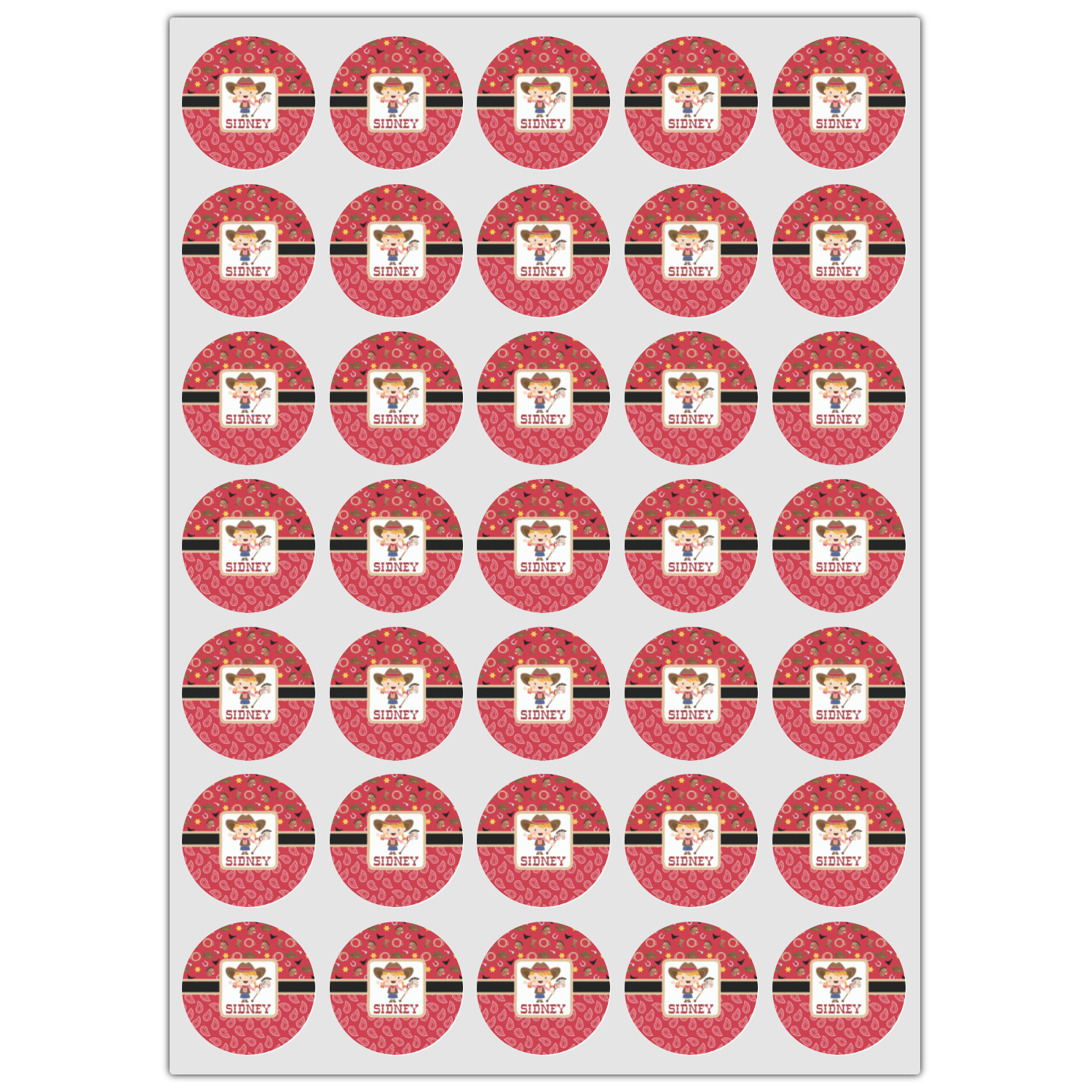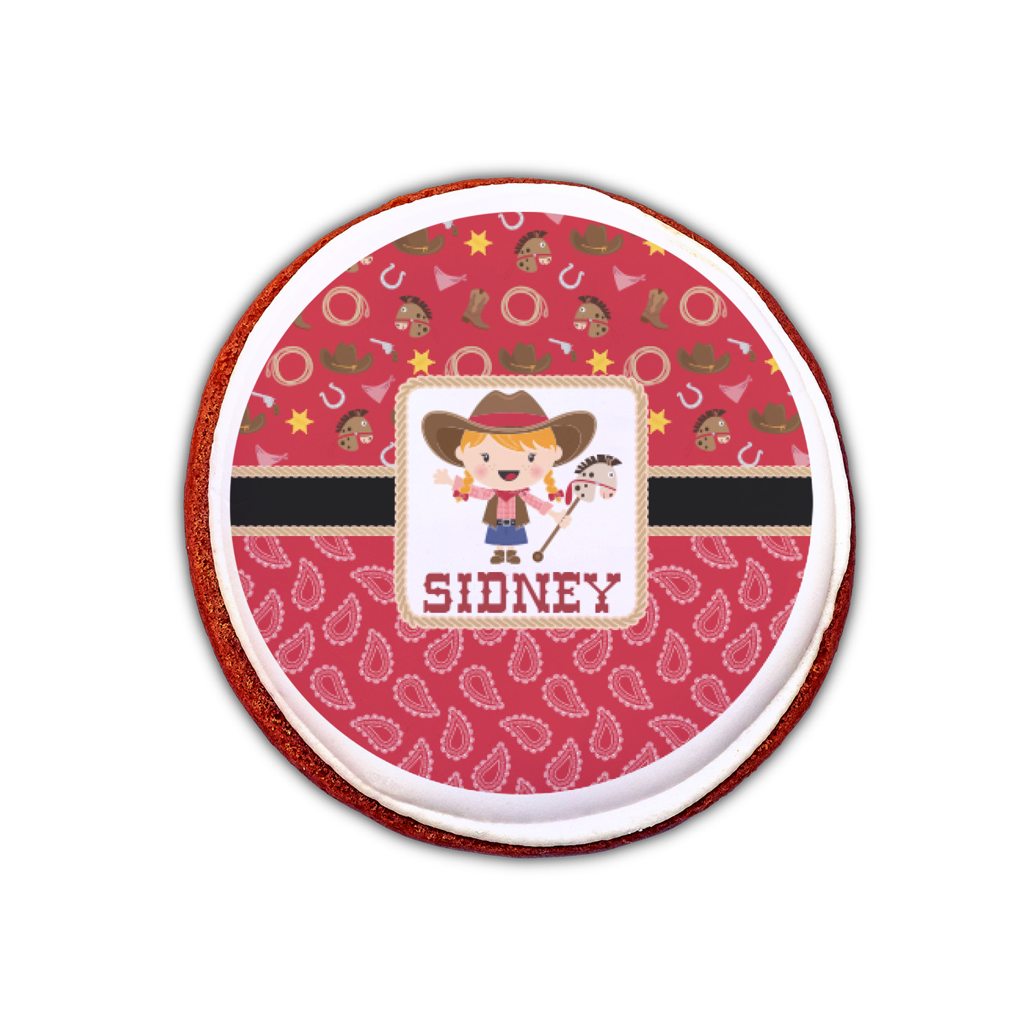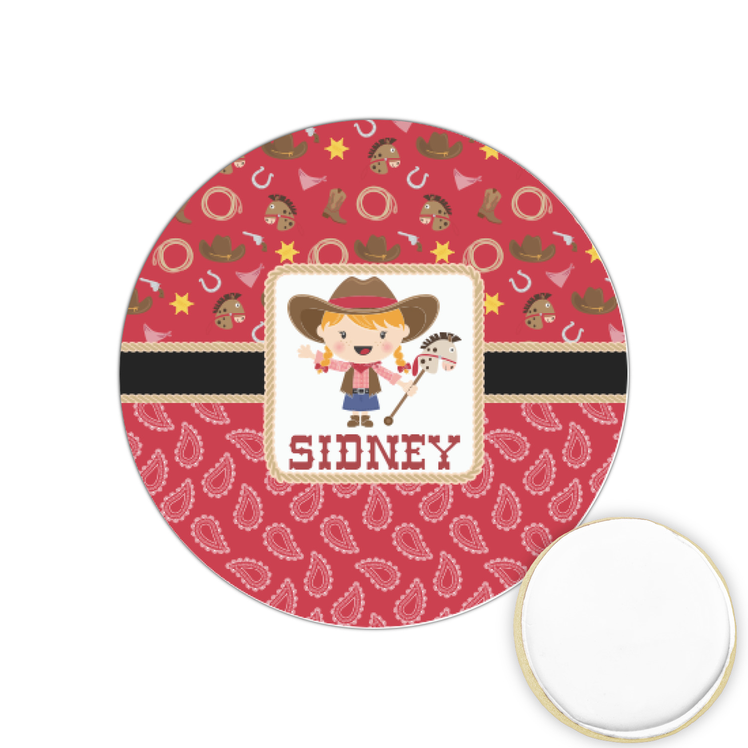 A rope outlined square label showcasing our cute little cowgirl holding her trick pony and lasso has your little one dreaming of riding the range one day.