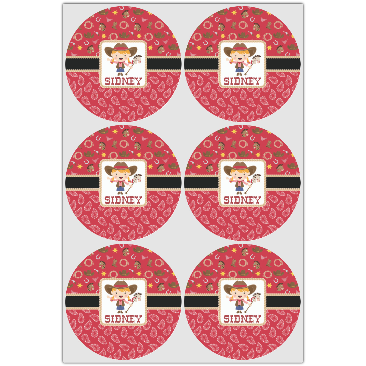 A rope outlined square label showcasing our cute little cowgirl holding her trick pony and lasso has your little one dreaming of riding the range one day.