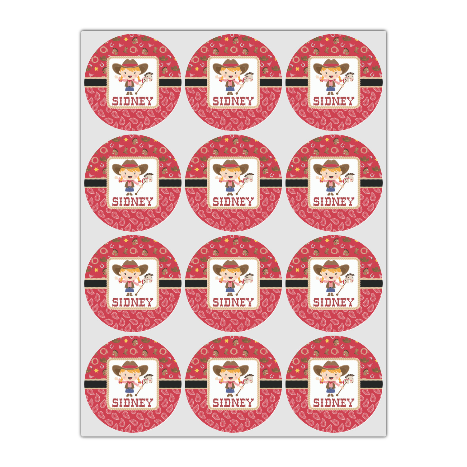 A rope outlined square label showcasing our cute little cowgirl holding her trick pony and lasso has your little one dreaming of riding the range one day.