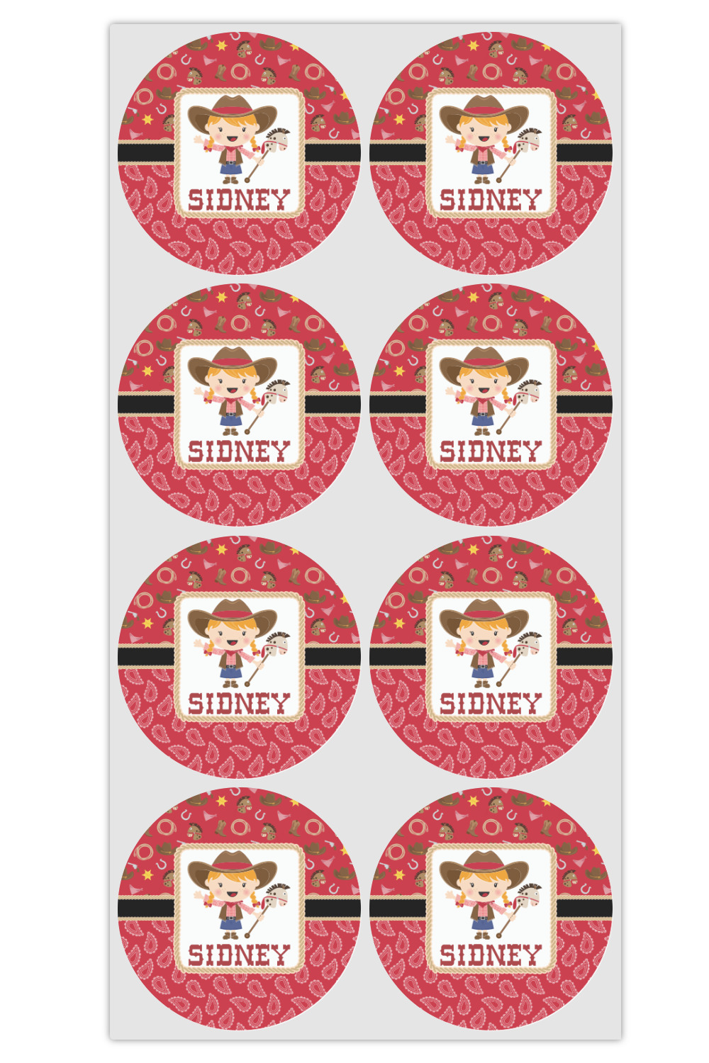 A rope outlined square label showcasing our cute little cowgirl holding her trick pony and lasso has your little one dreaming of riding the range one day.