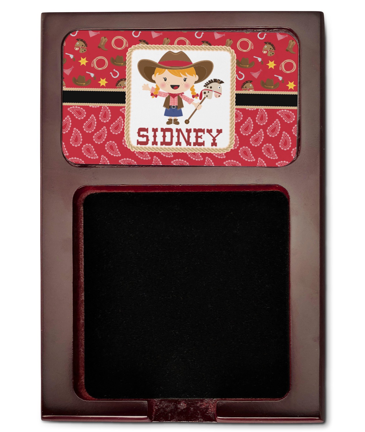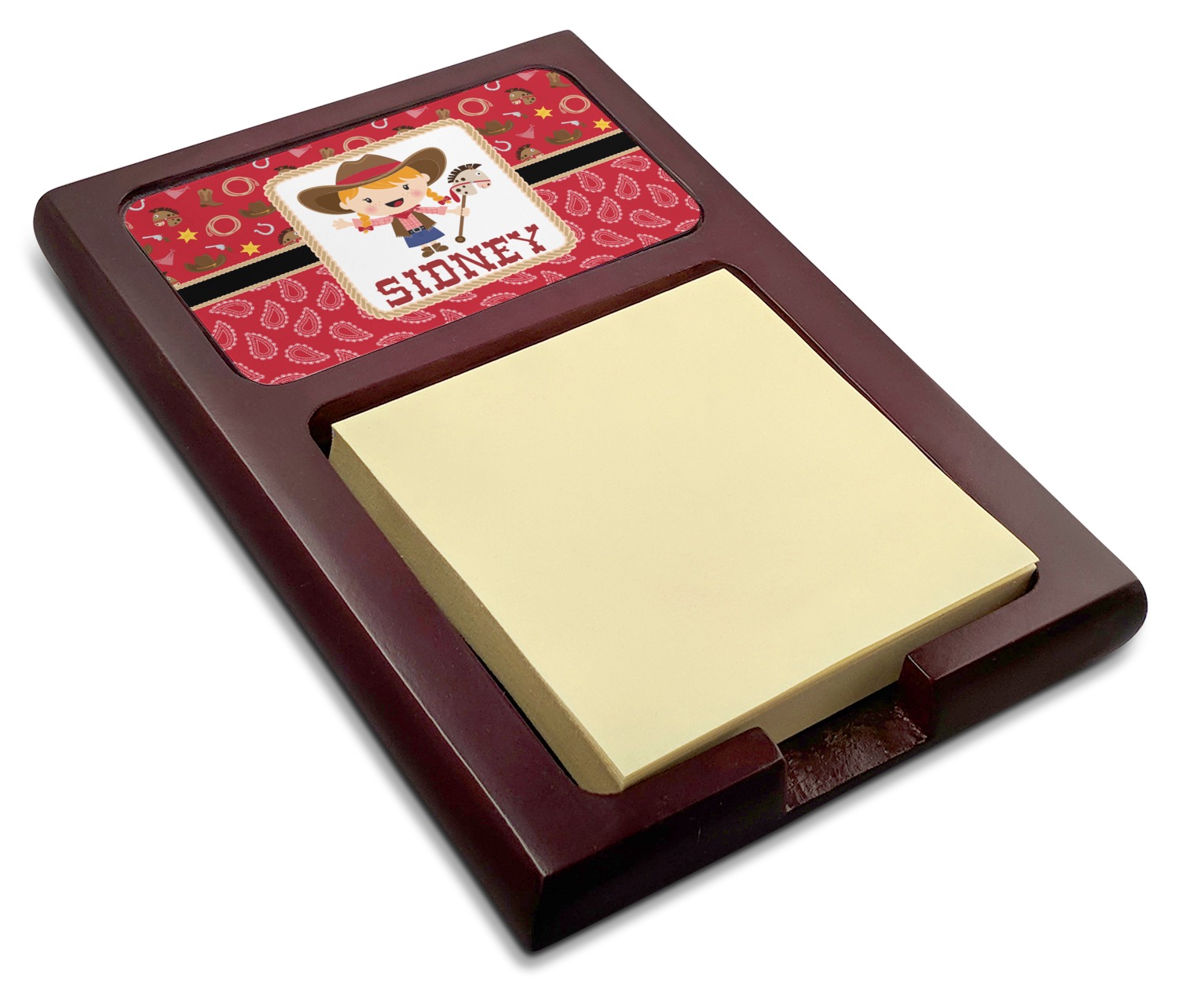 Crafted from a fine mahogany, this post it note holder is in the shade of a dark, cherry color. The dispenser itself is about 4.25 by 6.25 by 0.75 inches. You can place your 3 by 3 inch sticky notes in the indentation below the nameplate. We print your customization onto the nameplate that rests above the velvety indentation.