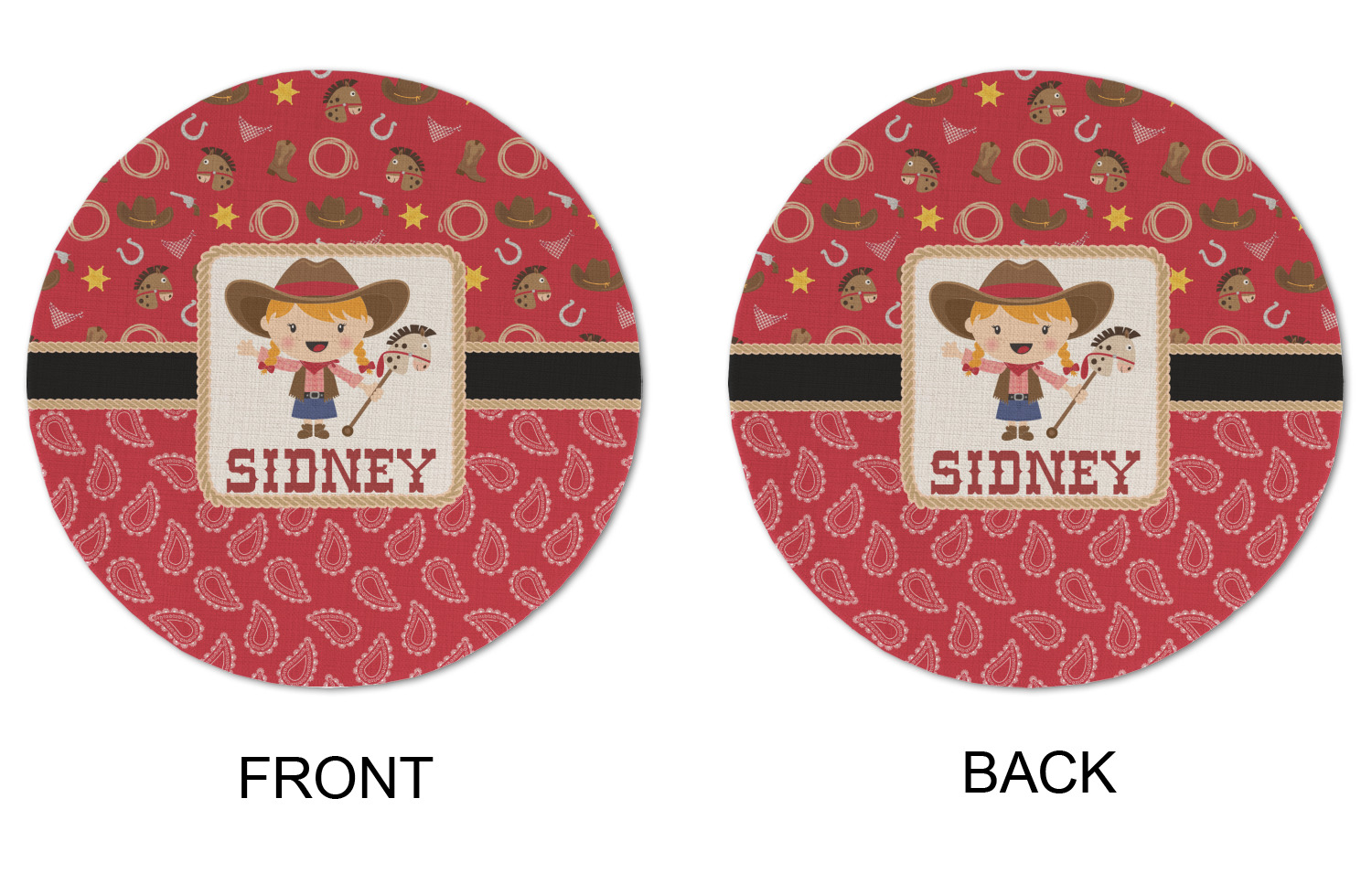 A rope outlined square label showcasing our cute little cowgirl holding her trick pony and lasso has your little one dreaming of riding the range one day.