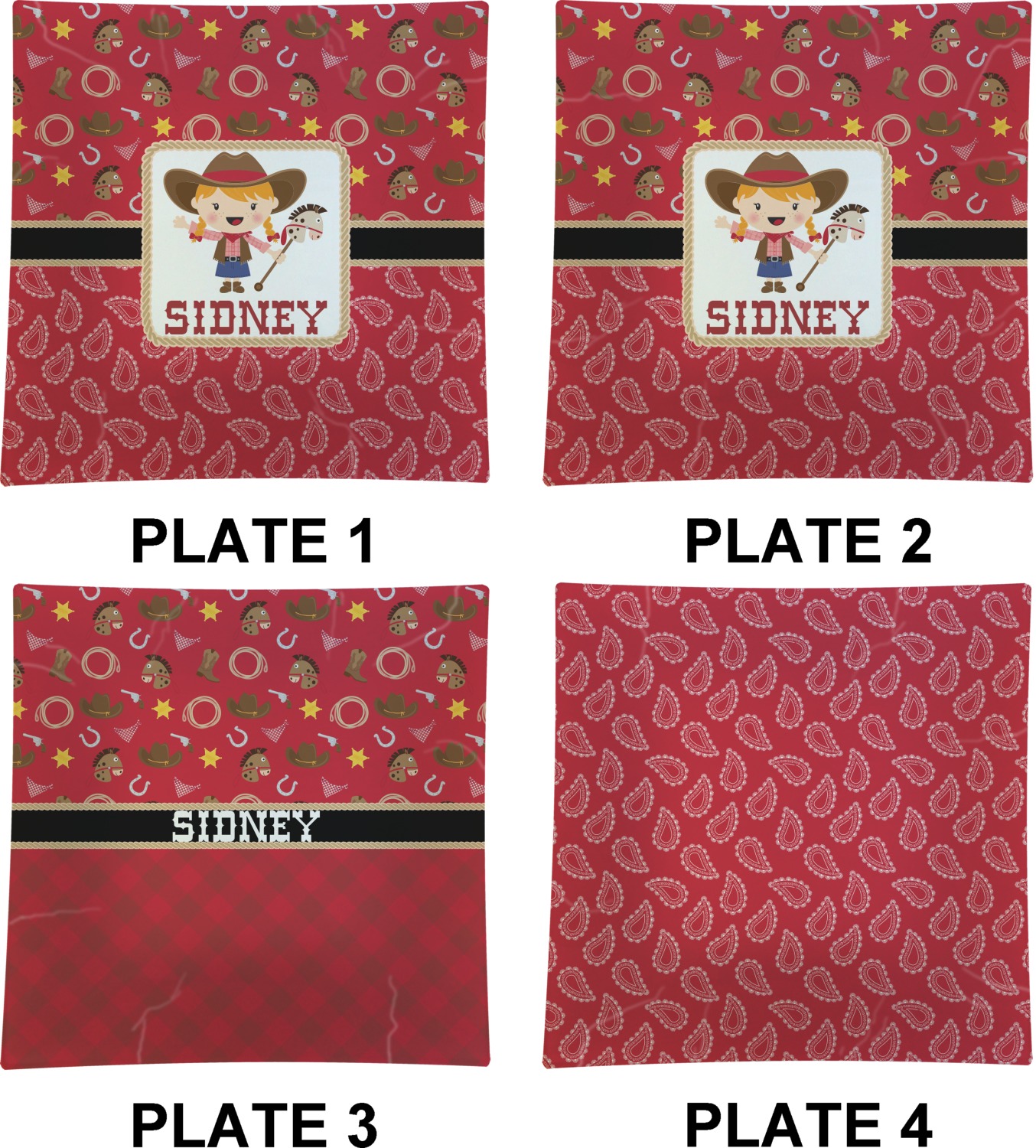 Howdy Y'all! What little country girl wouldn't want to be surrounded by this cute Western theme design? Set on a backdrop of red, the horses, cowboy boots and hats, rope, guns, Sheriff badges, and bandannas set the scene for a hoedown every day. A coordinating red gingham pattern on the bottom tie the entire design together. A wide band of red trimmed in rope add that special touch of design.