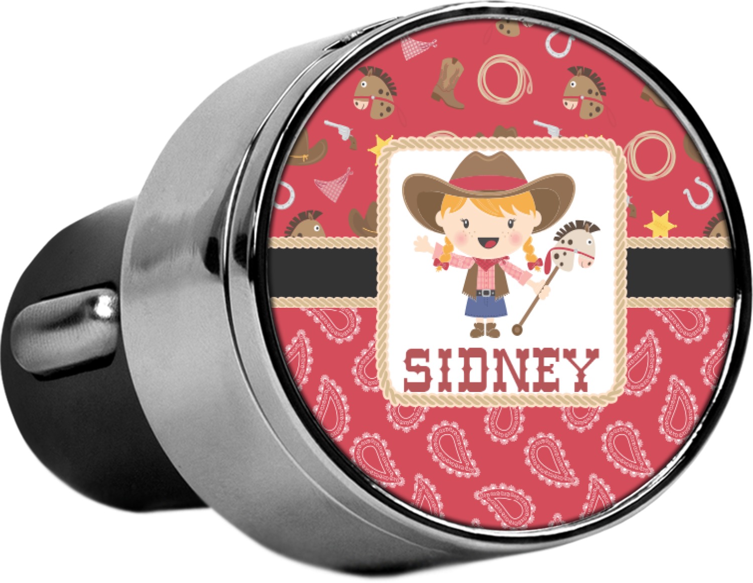 This car charger adapter converts your cars bland cigarette lighter into a decorative, personalized, and operational USB charging port. Made of solid, silver-plated metal, these chargers feature a flip-open lid that both displays your customized design and conceals two USB ports. The metal lid of the USB car charger adapter is 1.5" in diameter and seals due to a small, ingrained magnet on both the charger and its lid. The cigarette lighter insert, itself, is colored black.