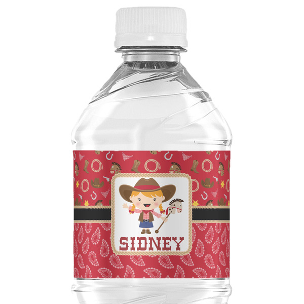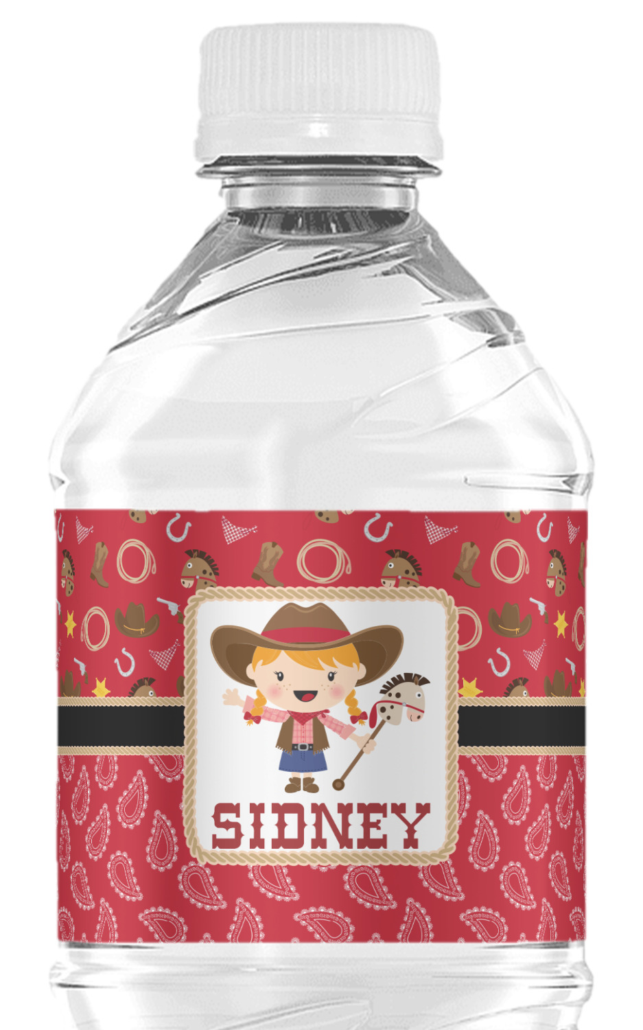 A rope outlined square label showcasing our cute little cowgirl holding her trick pony and lasso has your little one dreaming of riding the range one day.