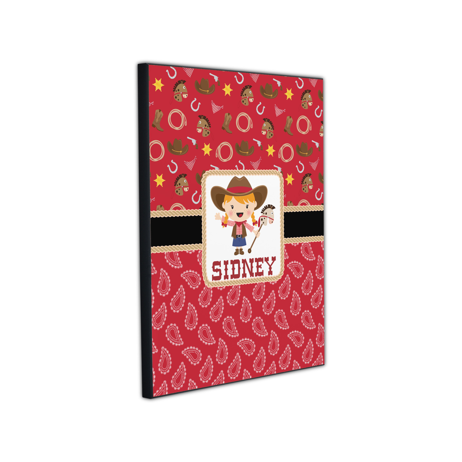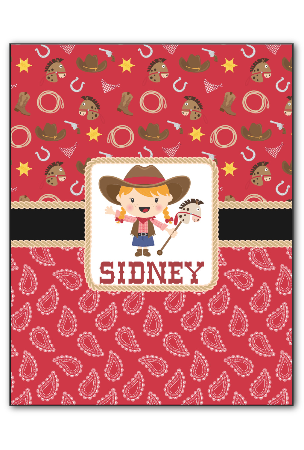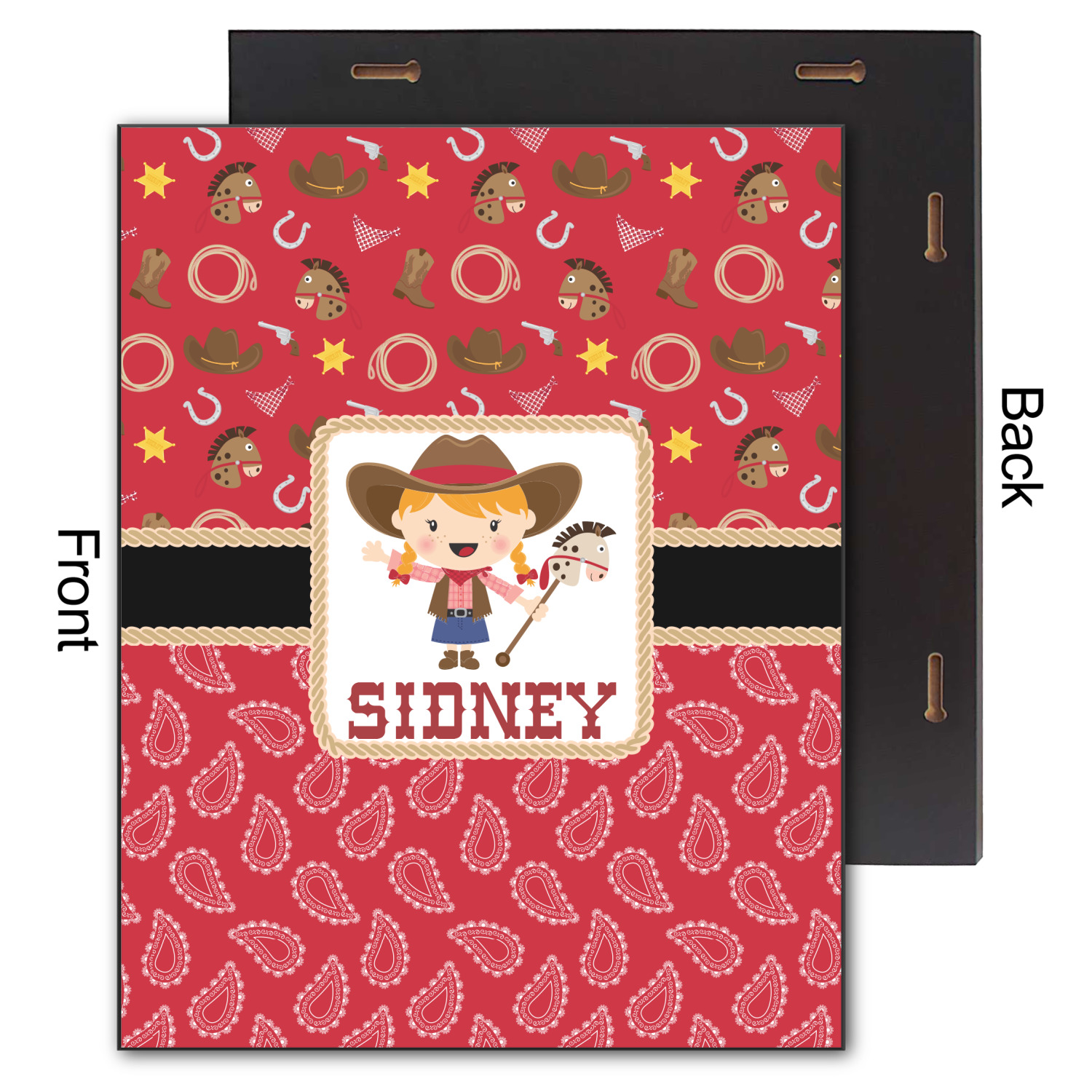 A rope outlined square label showcasing our cute little cowgirl holding her trick pony and lasso has your little one dreaming of riding the range one day.