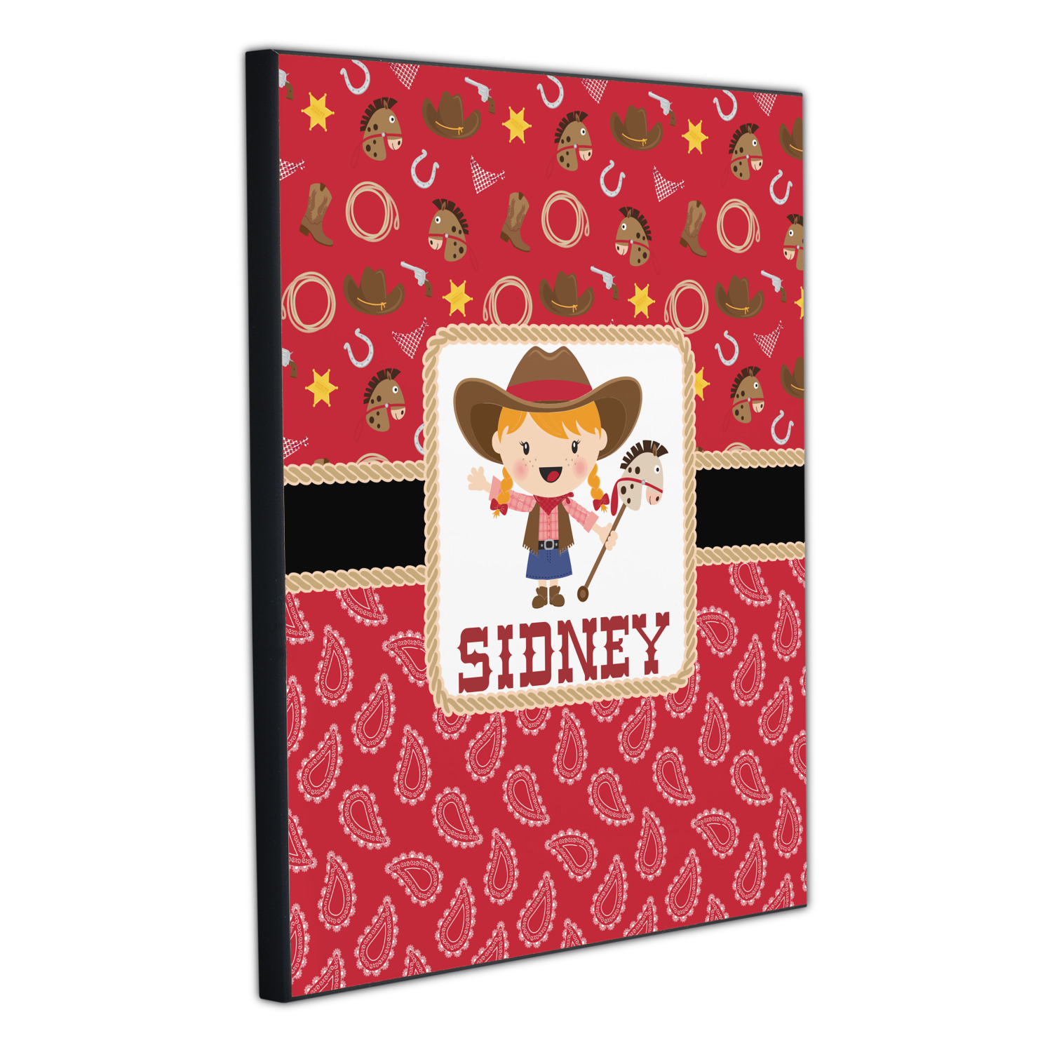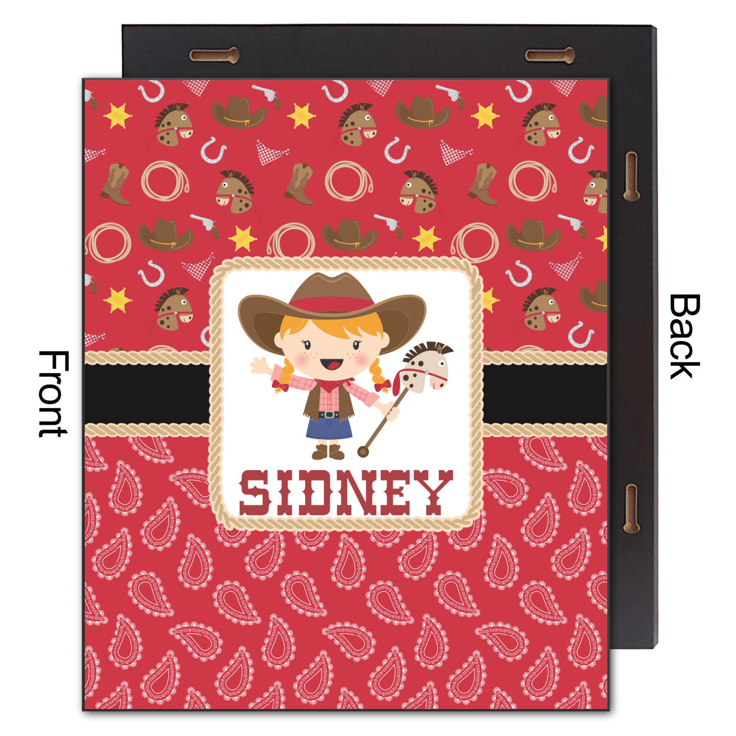 A rope outlined square label showcasing our cute little cowgirl holding her trick pony and lasso has your little one dreaming of riding the range one day.