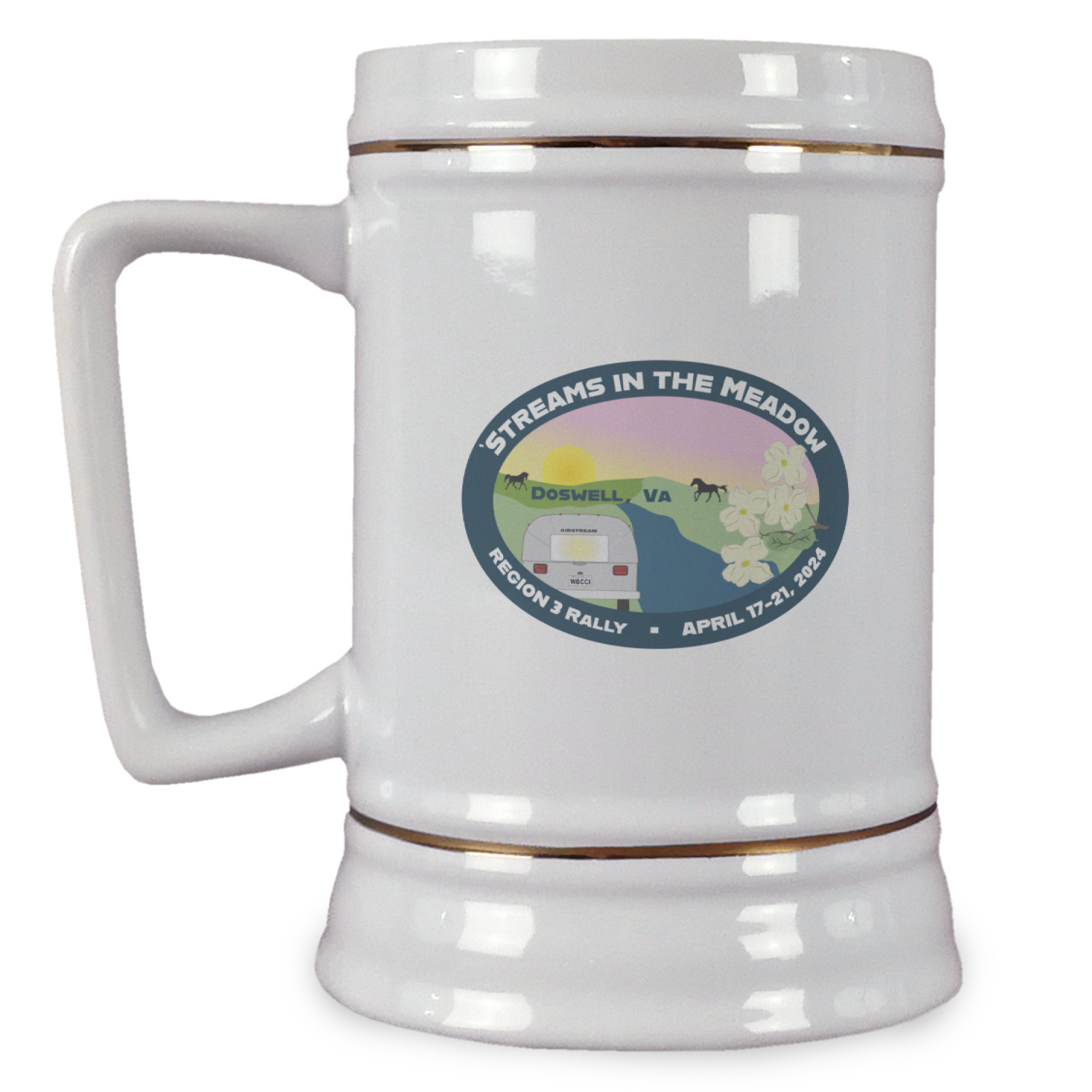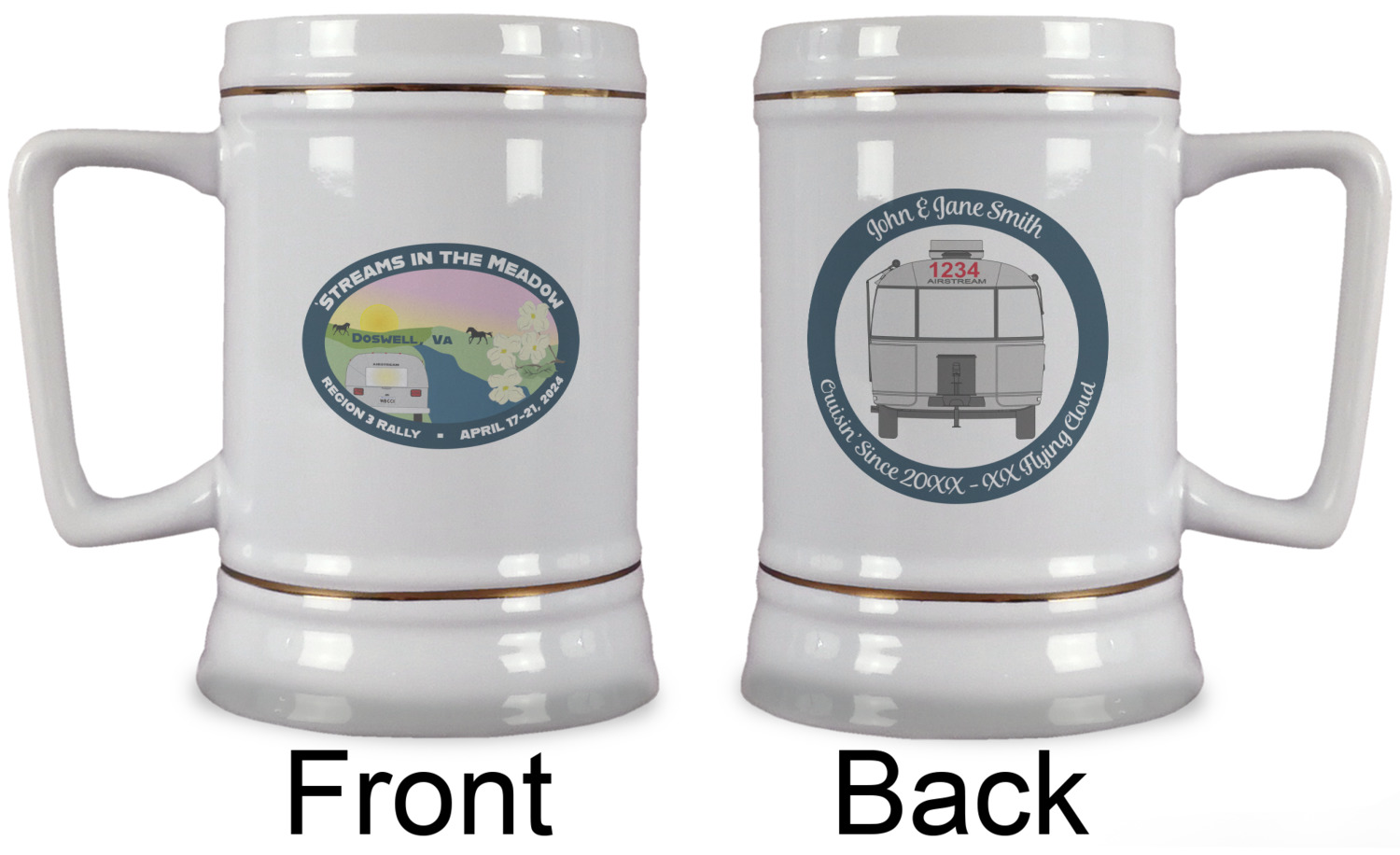 The beer steins are white in color, made from the highest quality ceramic and are approx. 5.5" tall with a top diameter of 3.5" and a bottom diameter of 4". They also have a D shaped handle that gives a modern touch to the classic European shaped beer stein. The beer steins also feature elegant gold pin stripes on the top and the bottom.