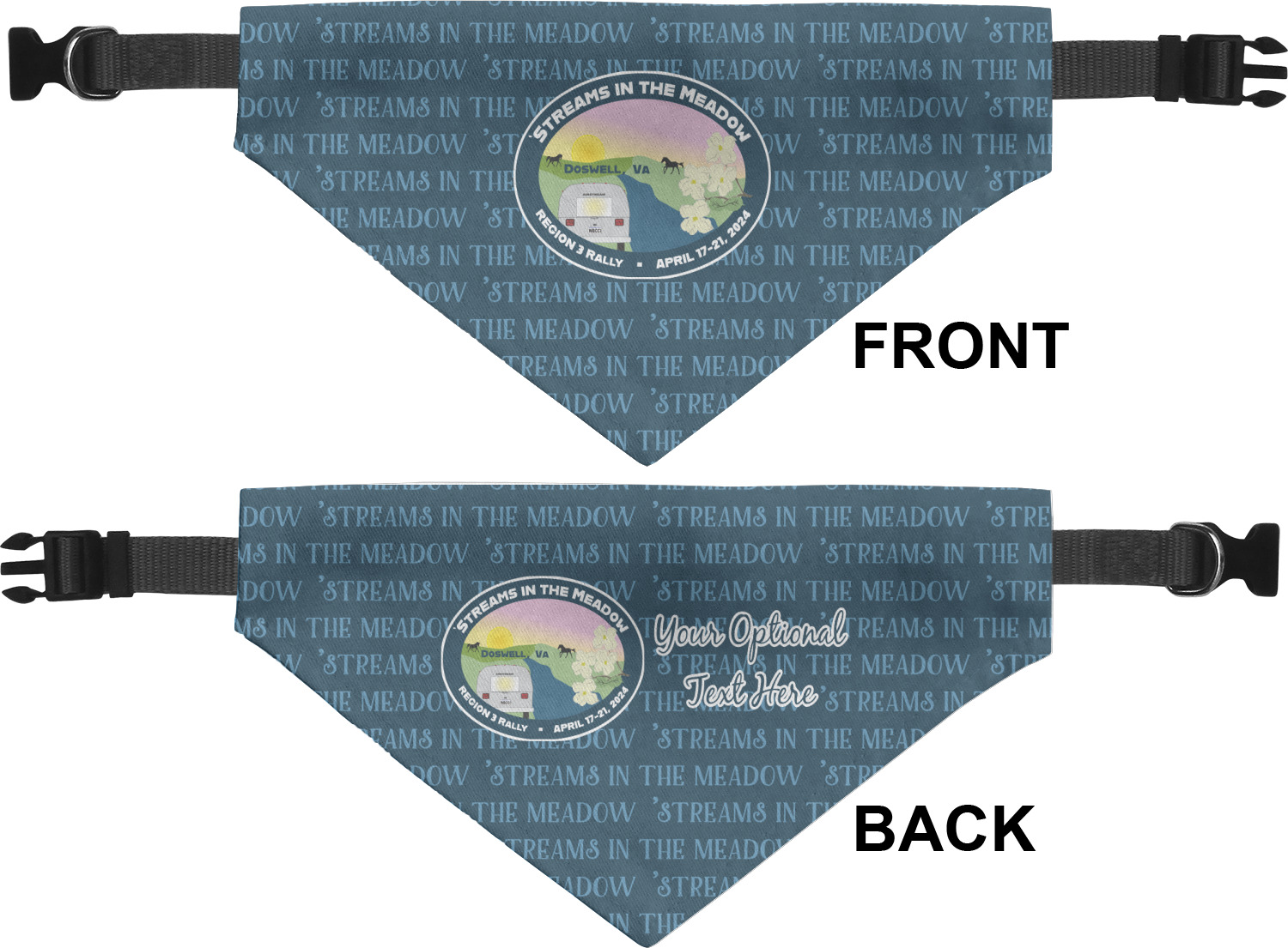 We print the front and back of these dog bandanas with your customized design. The bandana itself is made from a durable polyester, sewn together with a gap large enough to accommodate any collar. Regardless, the bandana includes a plain black, canvas collar with plastic snaps, that can easily be removed if desired. These dog bandana collars are available in four sizes: small, medium, large, and extra large. Please see our sizing chart for more information regarding the dimensions of each size.