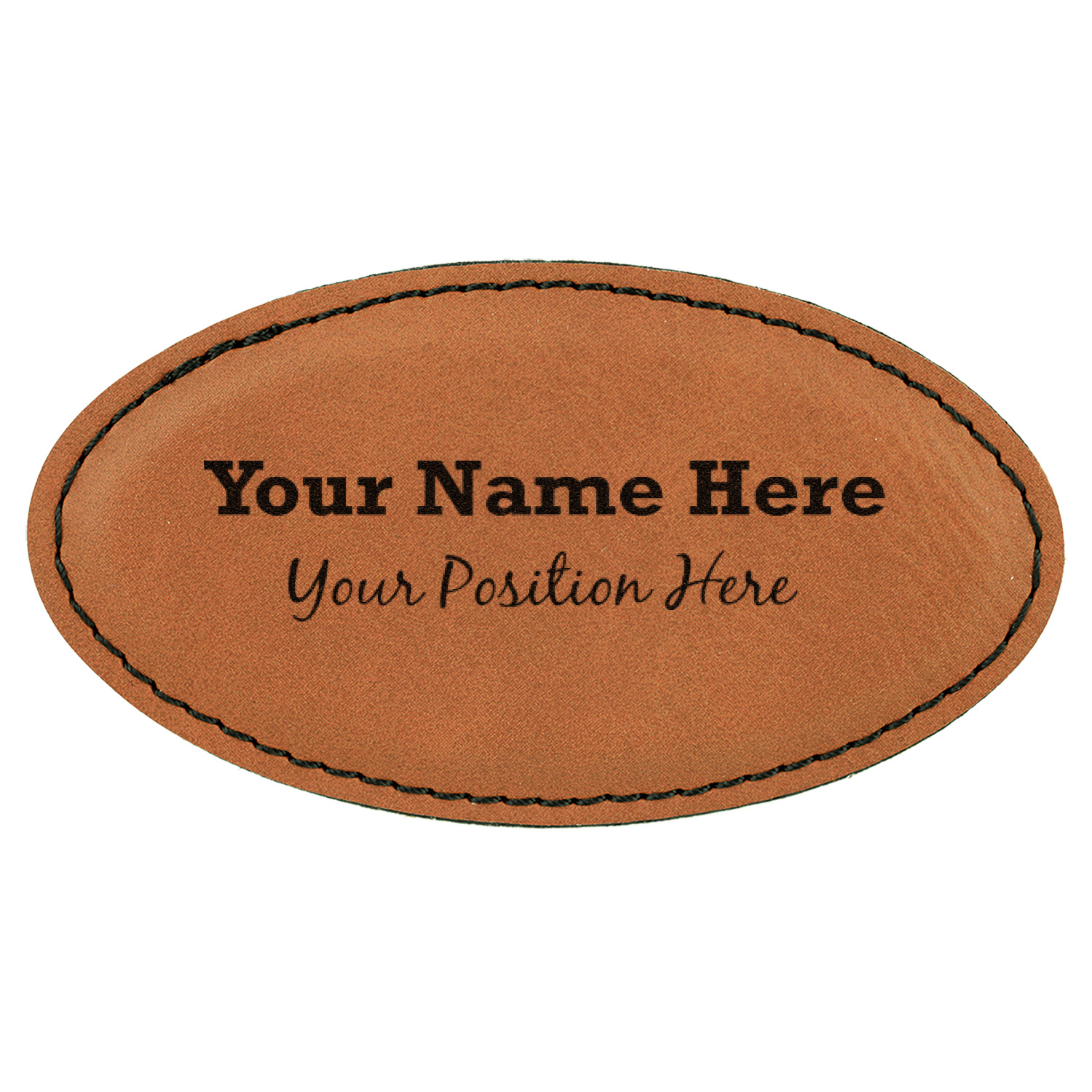 Made from a cognac-brown leatherette into an oval shape, these custom name badges measure at around 3.25" x 1.75". To add the suave appearance of this custom badge, a fine black stitching lines the edges or the badge itself. Your customized design is laser-engraved onto the surface of the leatherette. Accompanying your purchase is a removable magnet strip that can be used to secure the engraved name tag to any shirt, dress, or jacket.